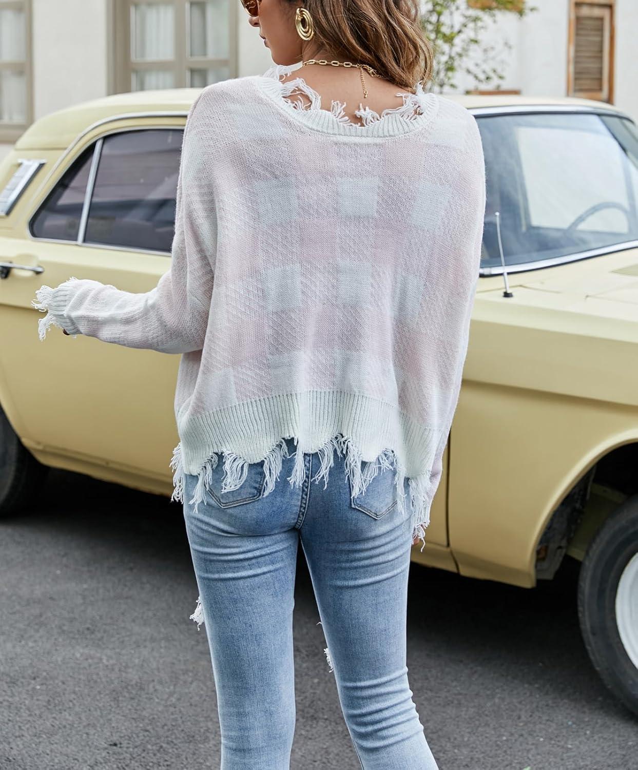 chouyatou Women’s Cute Y2k Ripped Sweater Frayed V-Neck Loose-Fit Floral Knitted Pullover Crop Top(Checked Green)