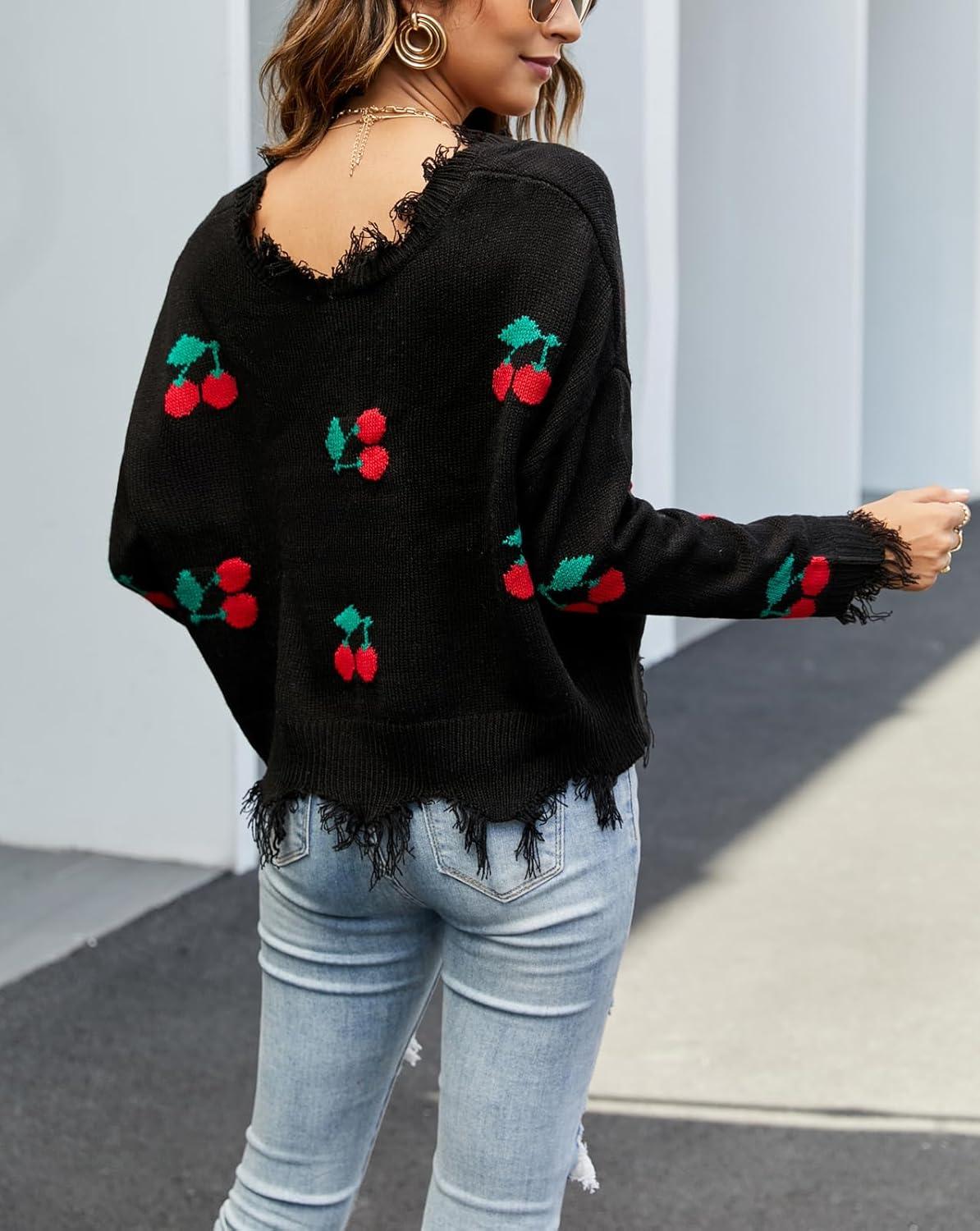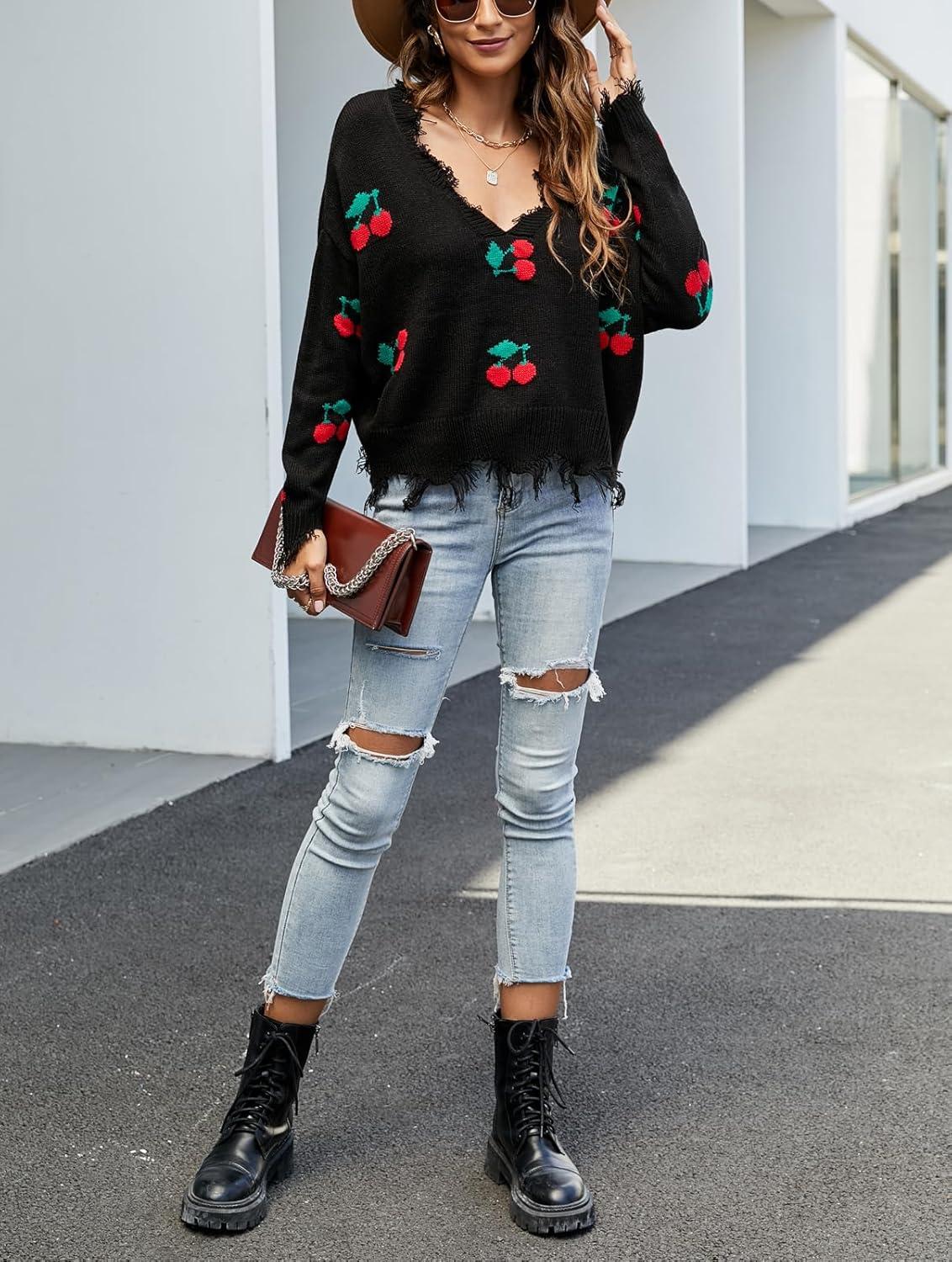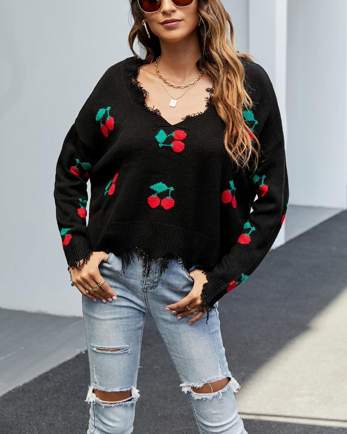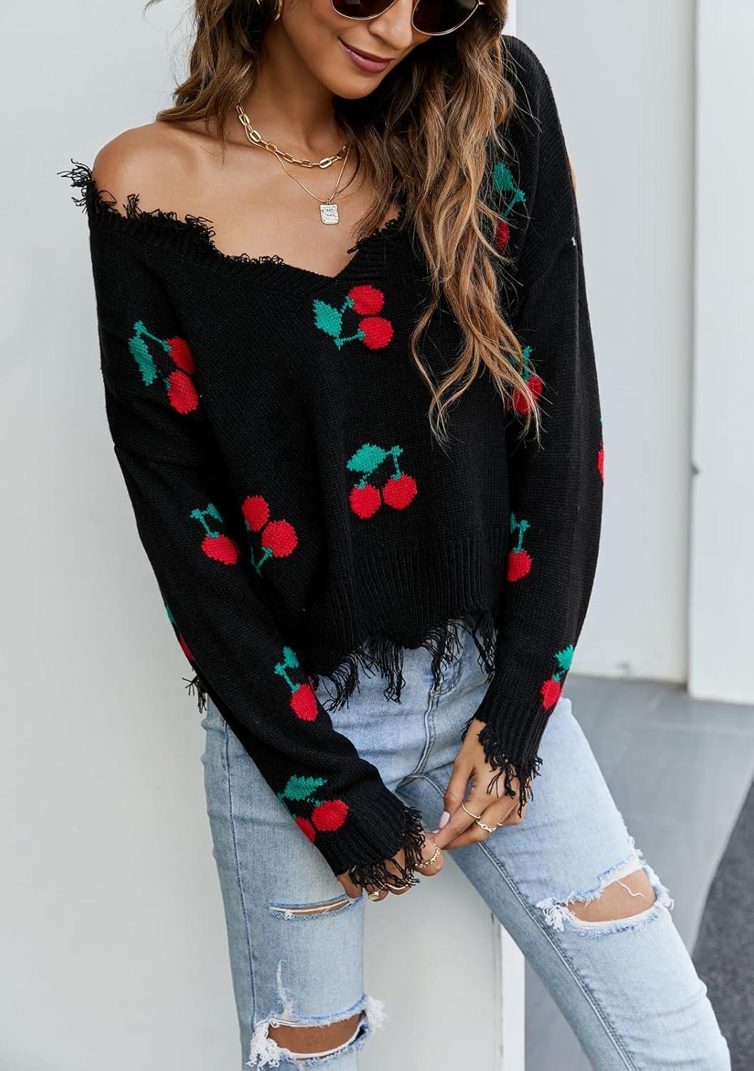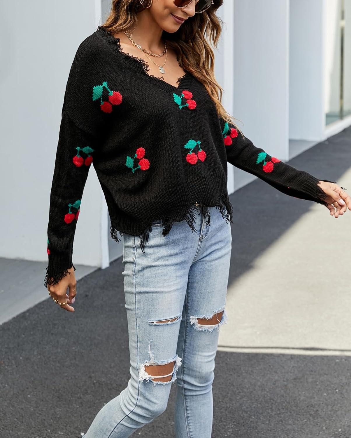 chouyatou Women’s Cute Y2k Ripped Sweater Frayed V-Neck Loose-Fit Floral Knitted Pullover Crop Top(Cherry Black)