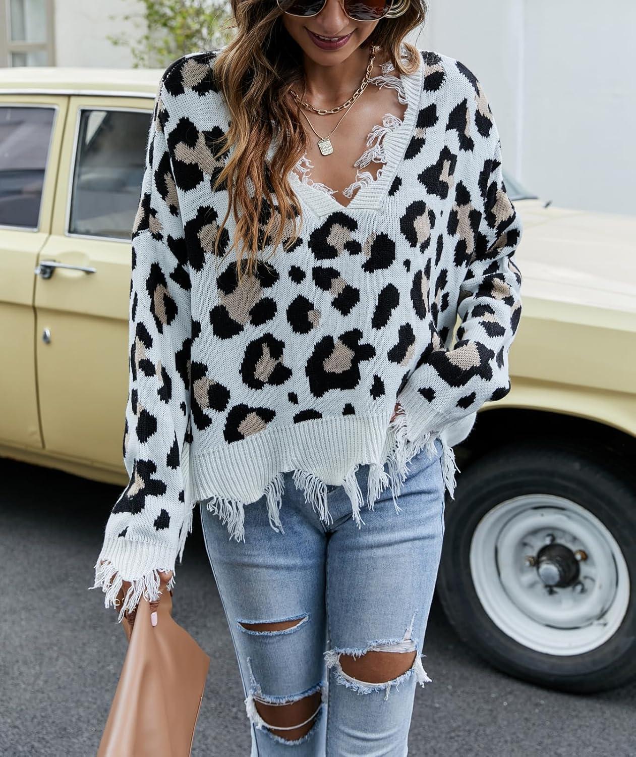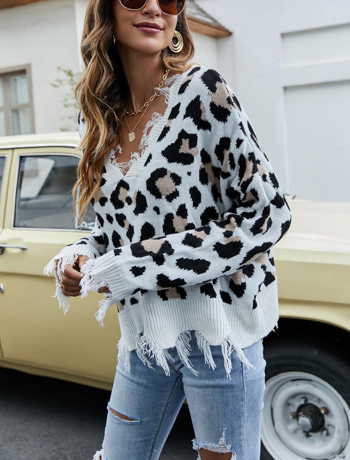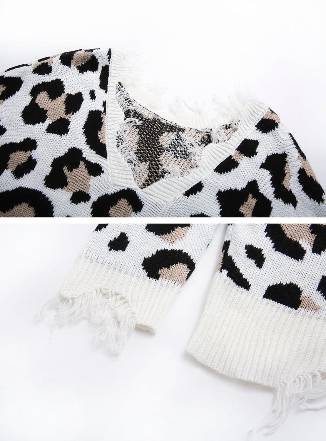 chouyatou Women's Cute Y2k Ripped Sweater Frayed V-Neck Loose-Fit Floral Knitted Pullover Crop Top(Leopard White)