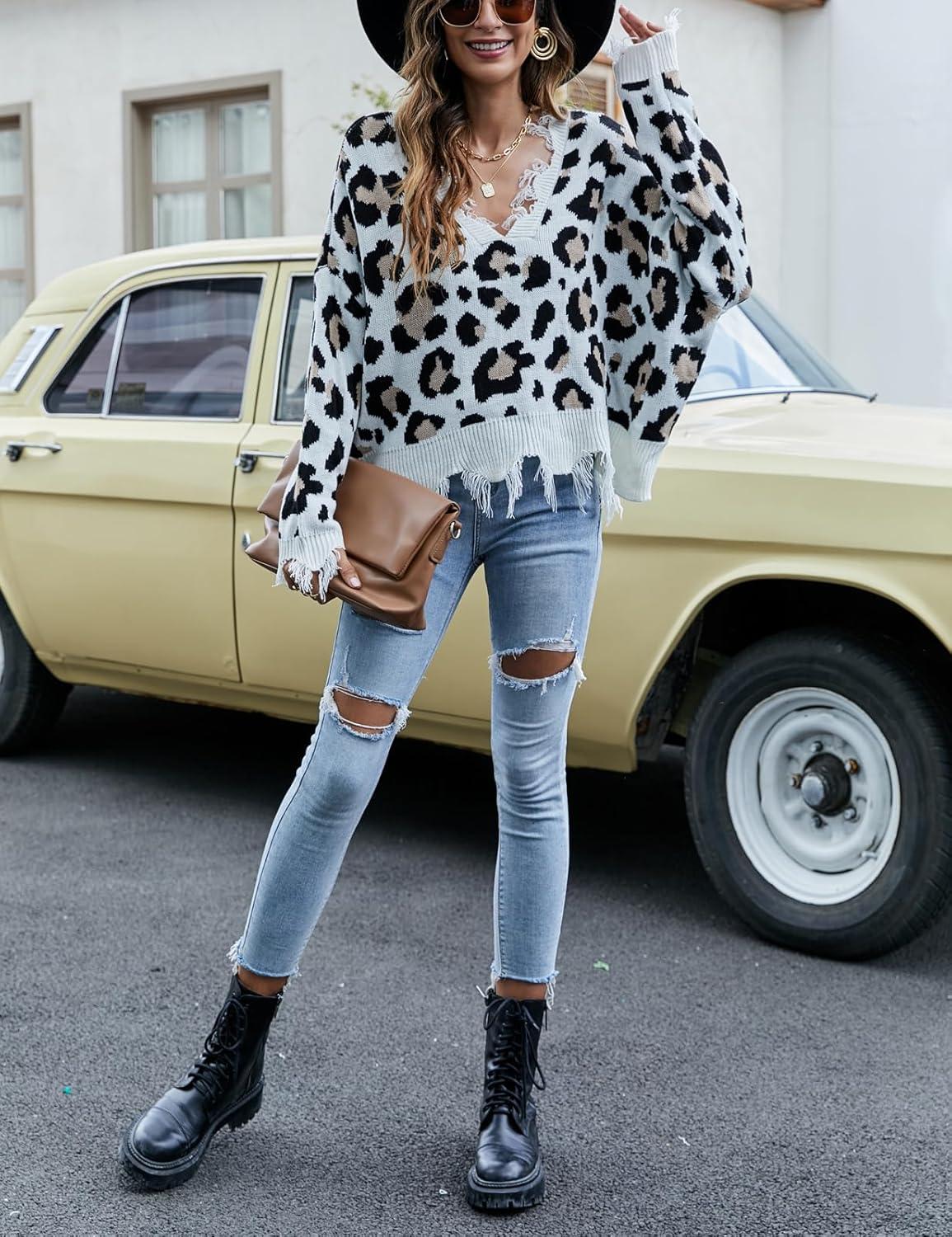 Be the first to review “chouyatou Women’s Cute Y2k Ripped Sweater Frayed V-Neck Loose-Fit Floral Knitted Pullover Crop Top(Leopard White)”