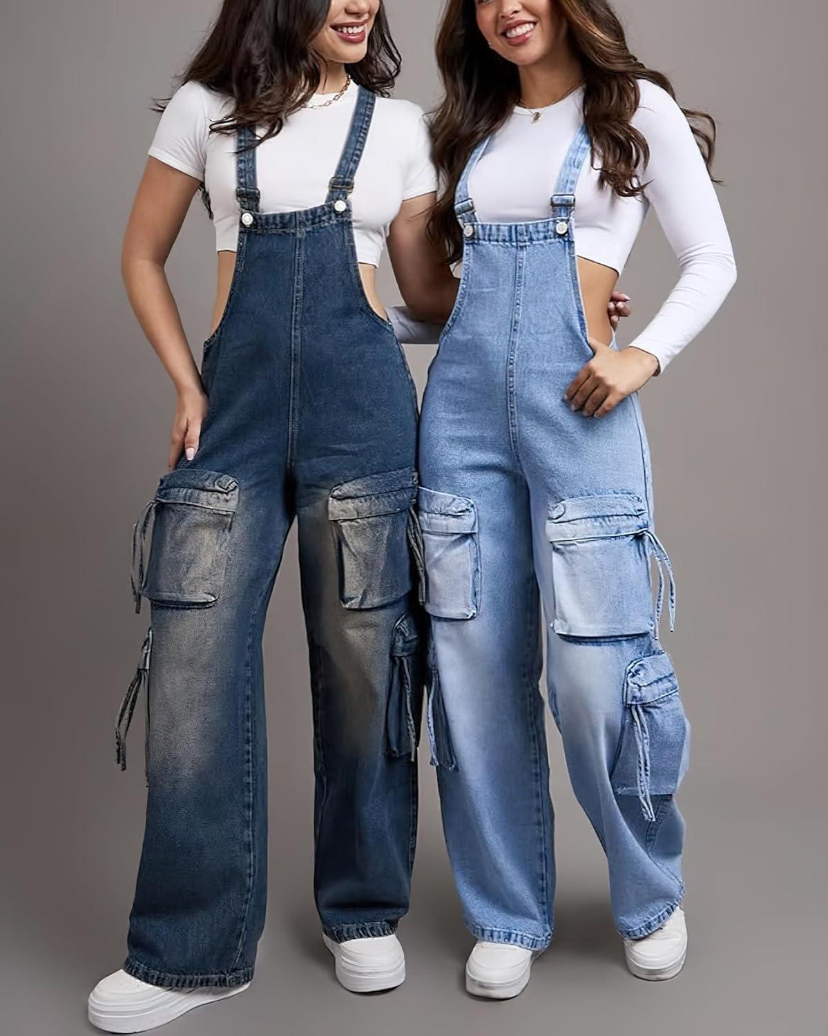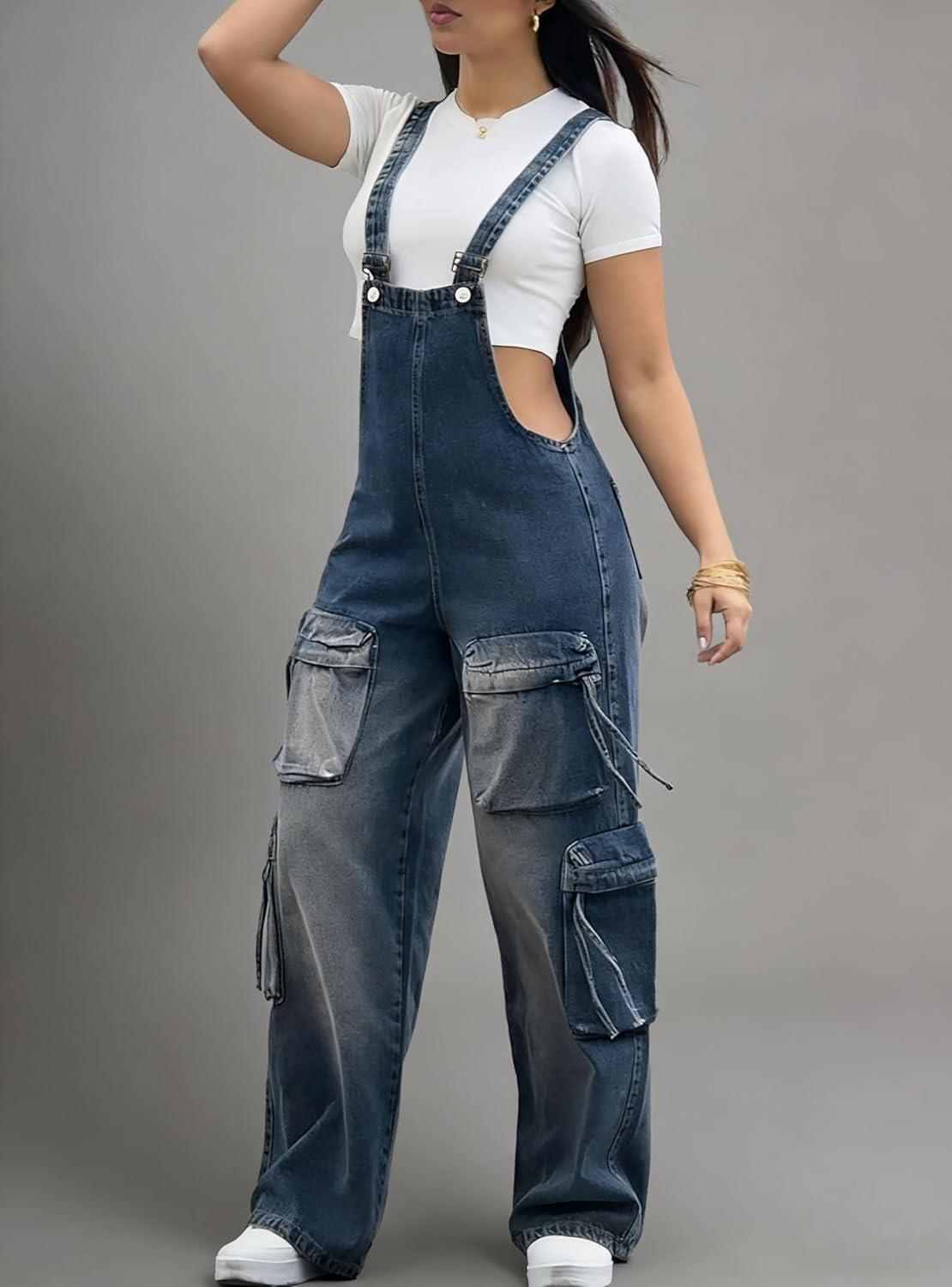 chouyatou Women’s Denim Bib Overalls Adjustable Strap Cargo Utility Jean Jumpsuits Loose Fit Romper(Dark Blue)