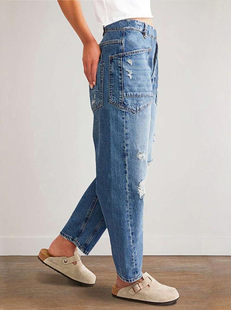CHOUYATOU Women’s Distressed Mid Rise Barrel Jeans Boyfriend Y2K Ripped Patchwork Denim Pant with Pockets(Blue)