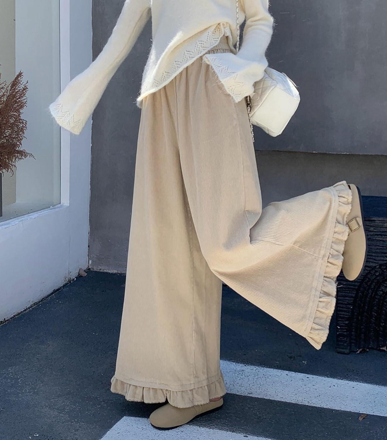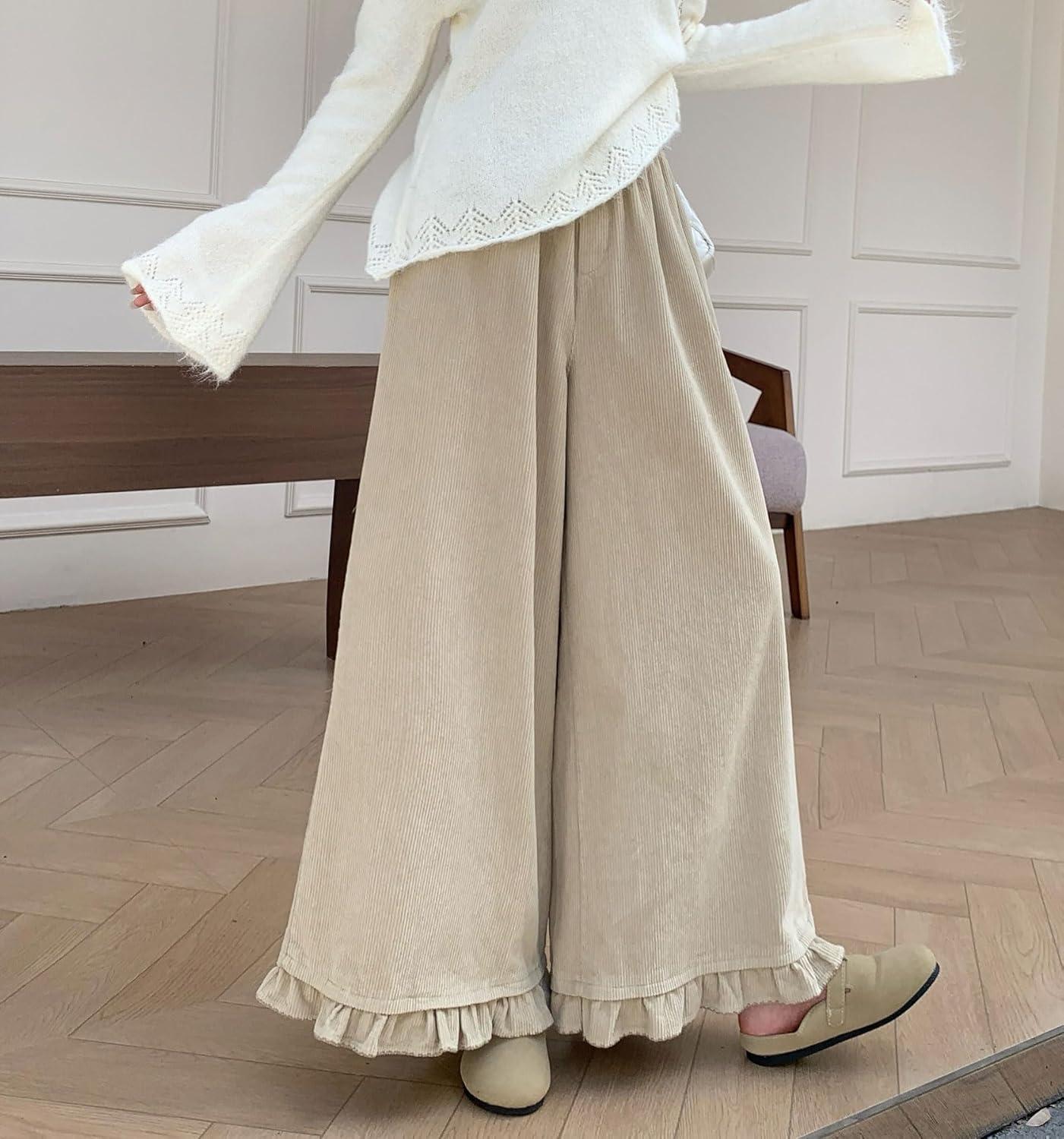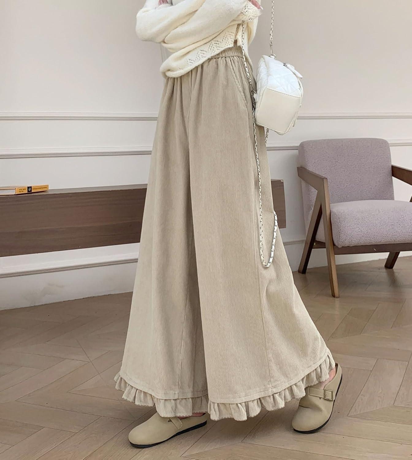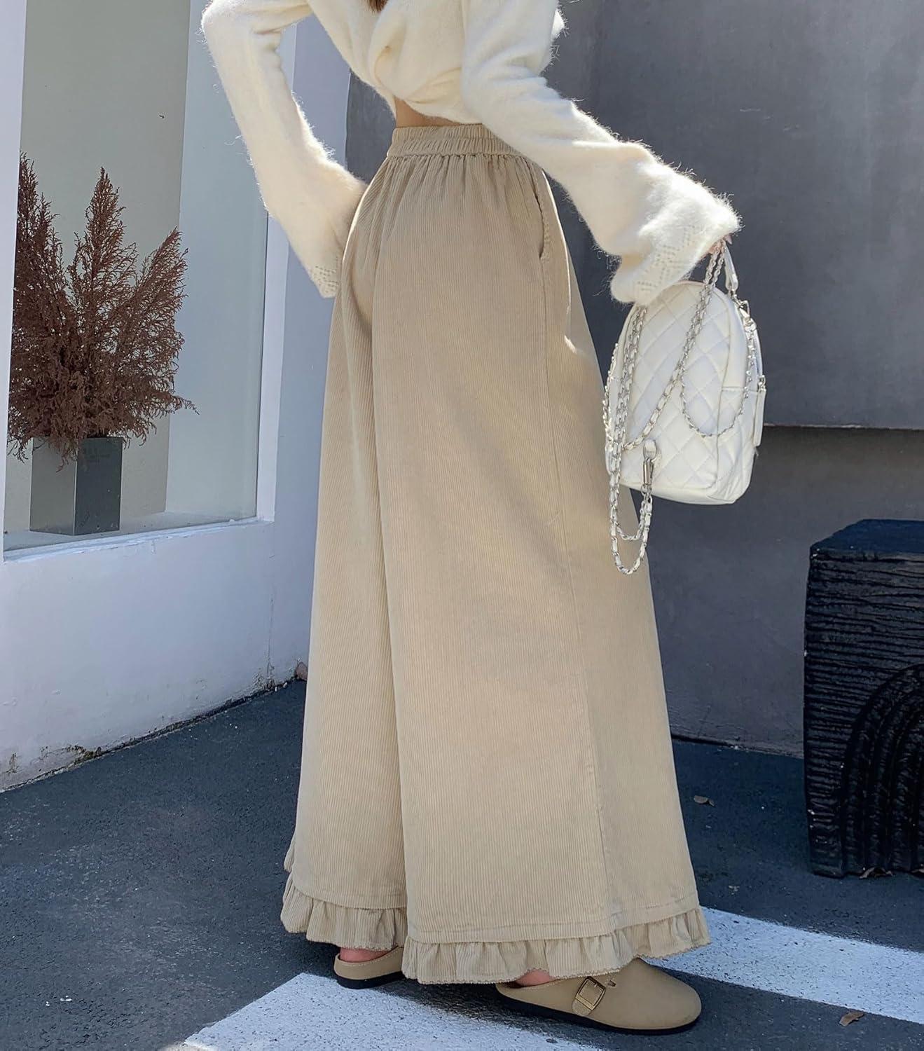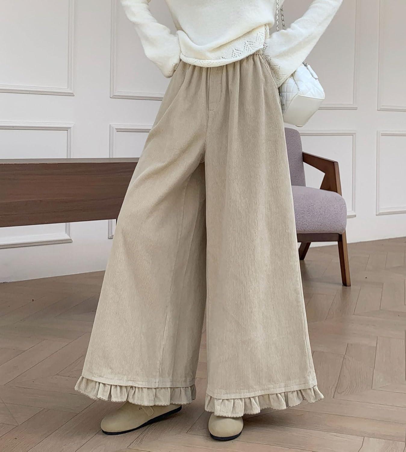 chouyatou Women's Elastic Waist Corduroy Wide Leg Pants Flare Bell Bottom Long Palazzo Pants Culottes with Pockets(Apricot)