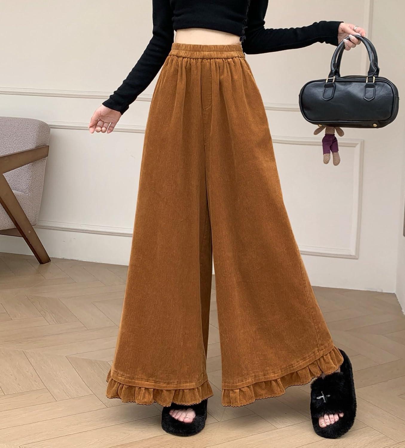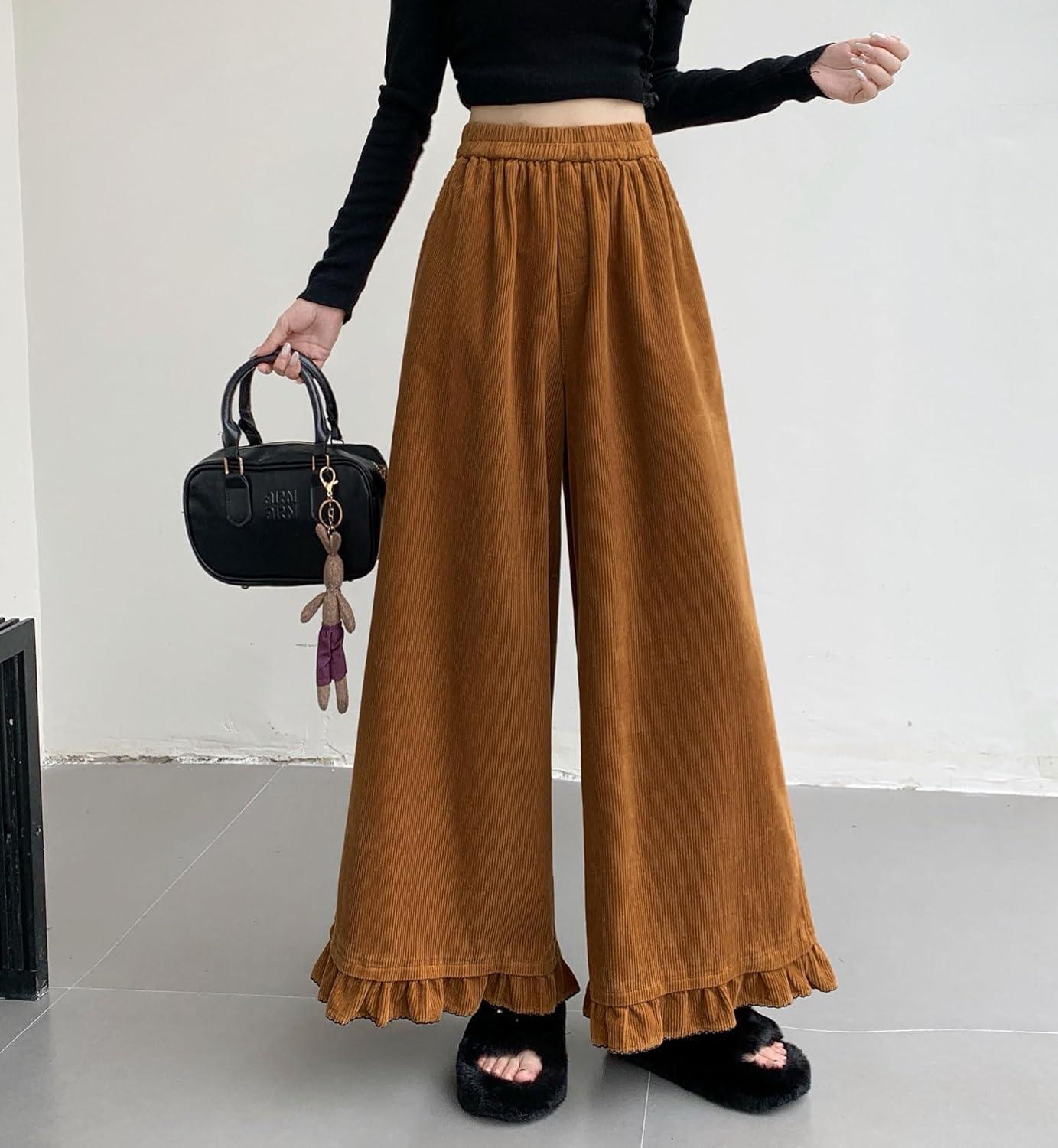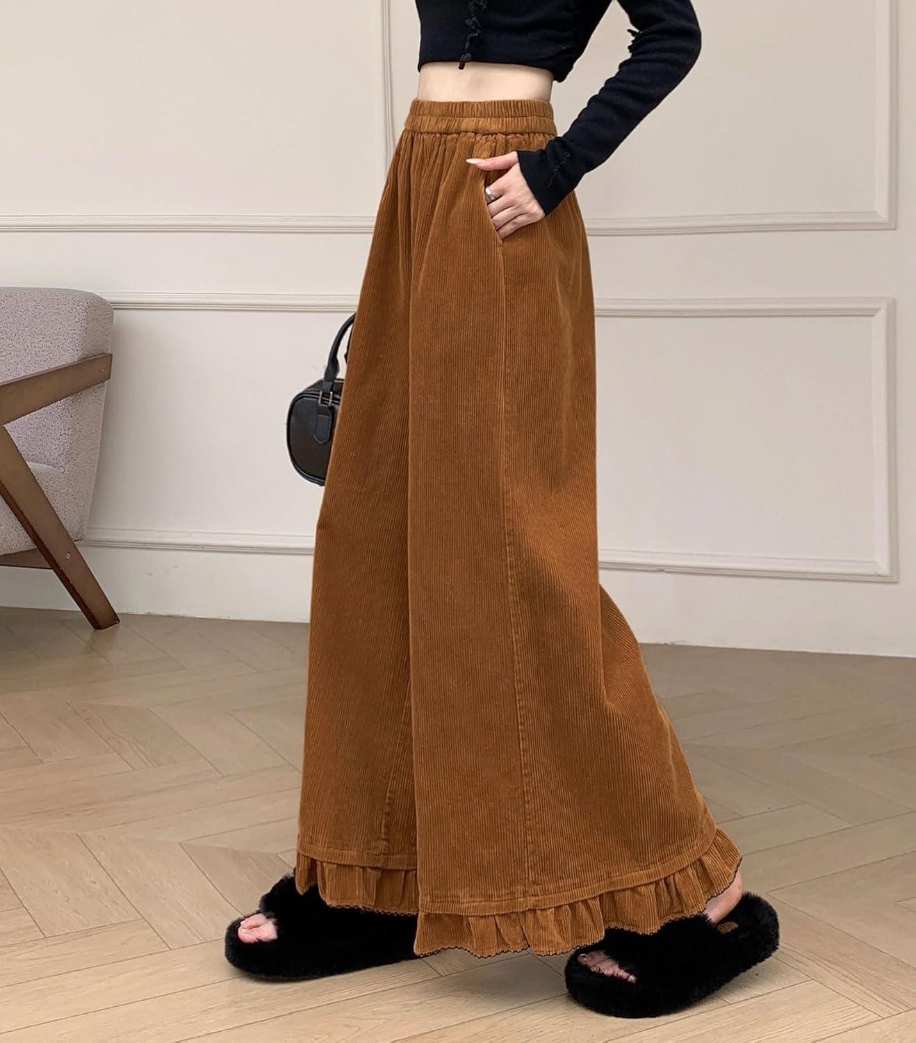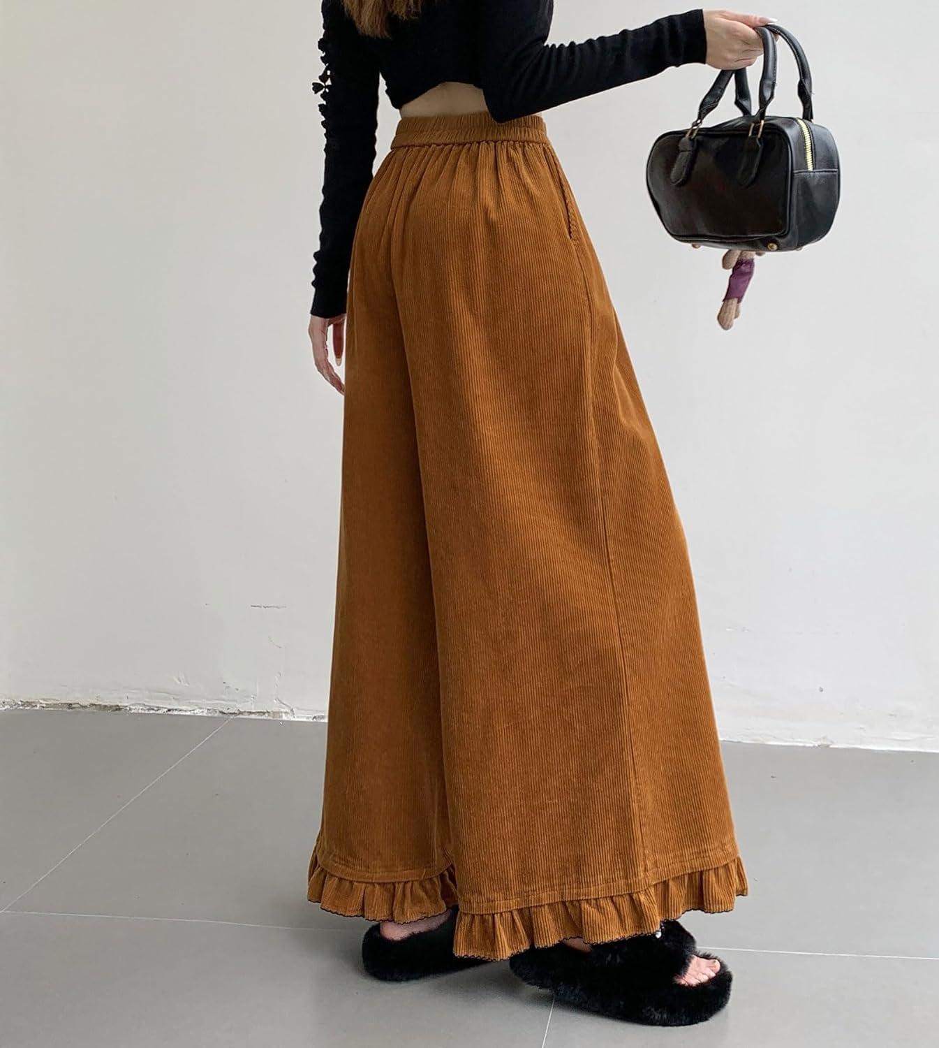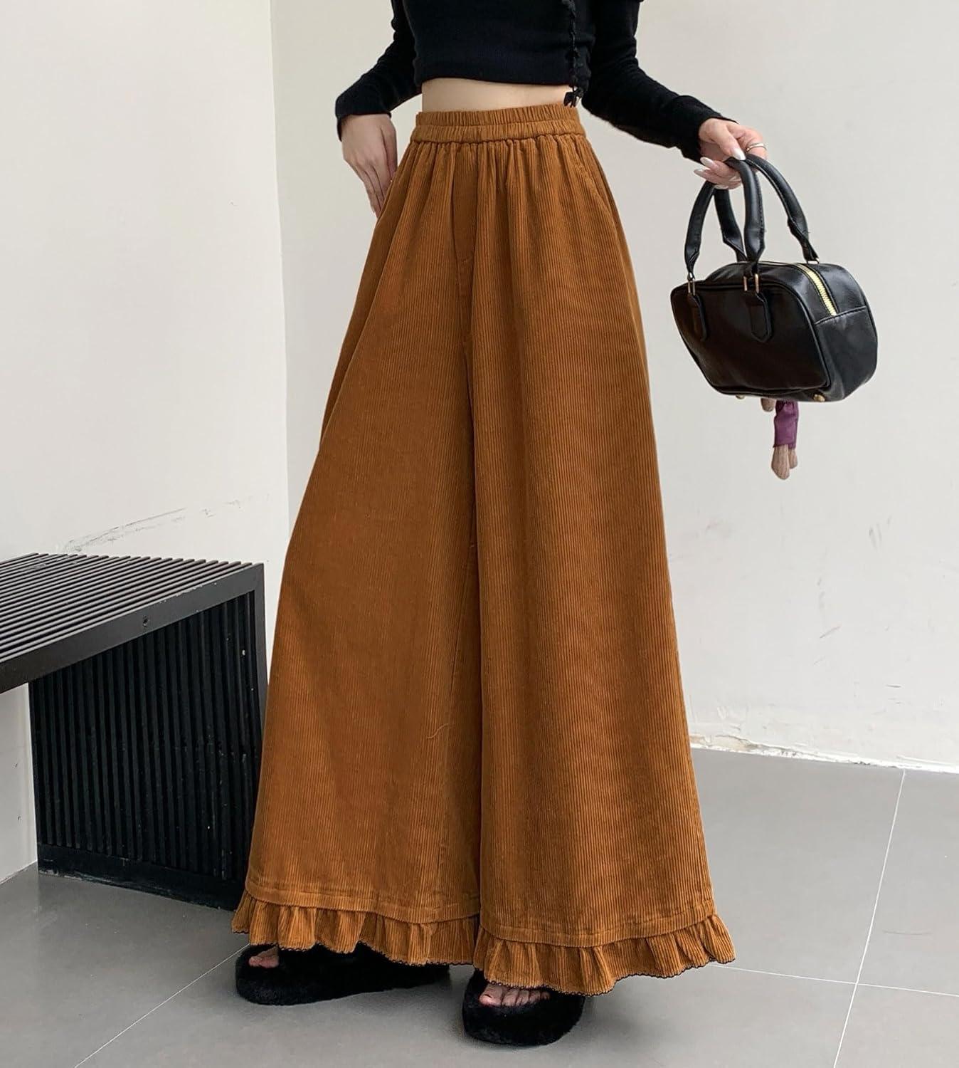 chouyatou Women’s Elastic Waist Corduroy Wide Leg Pants Flare Bell Bottom Long Palazzo Pants Culottes with Pockets(Brown)