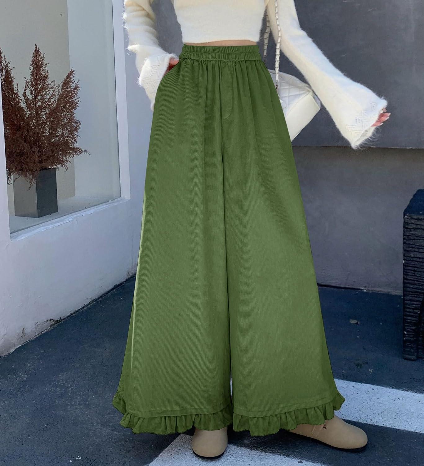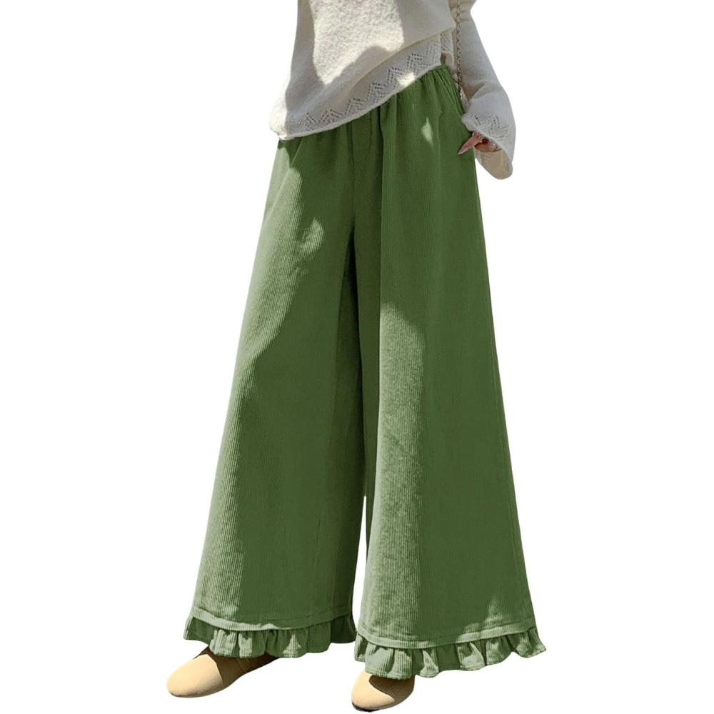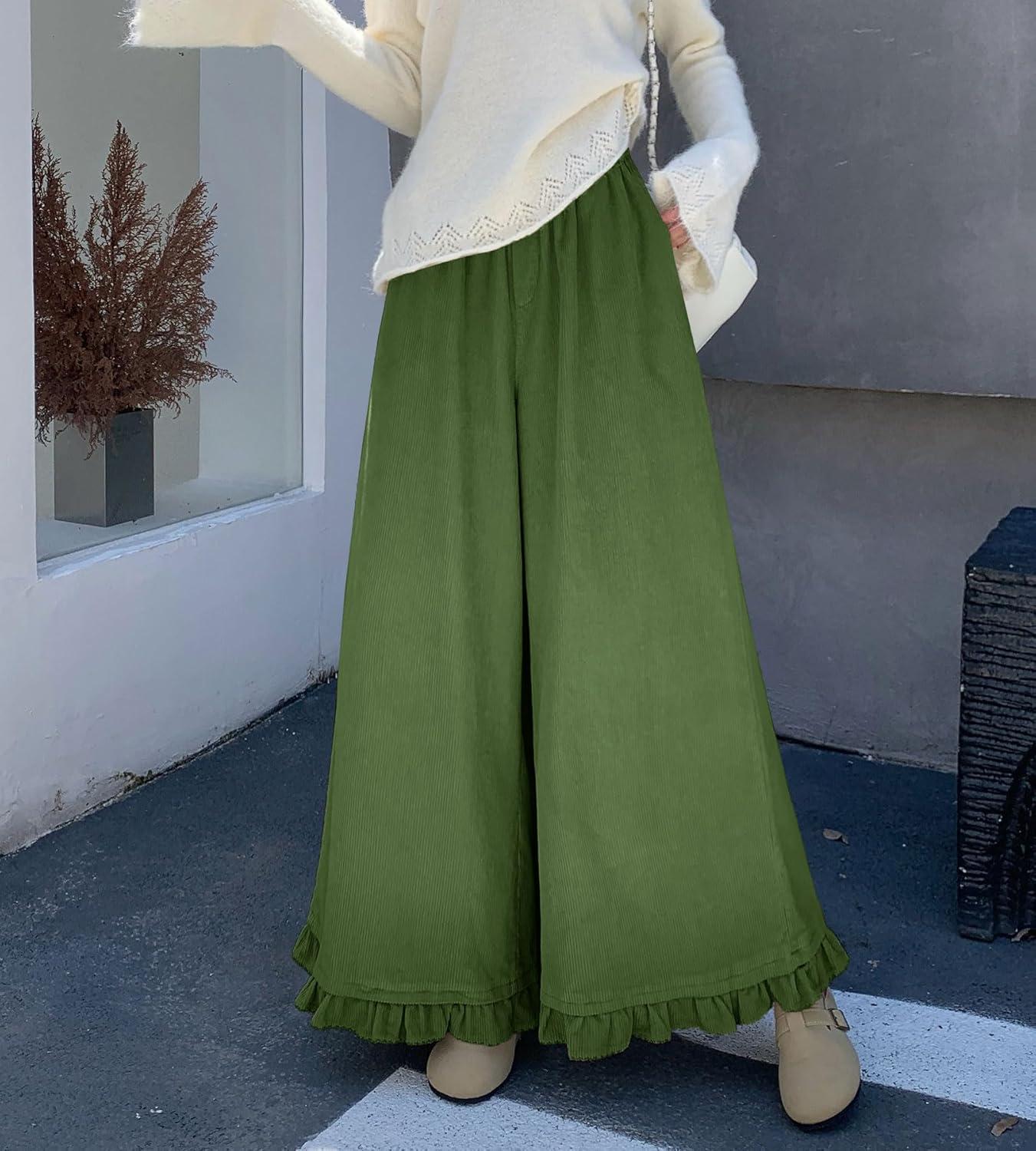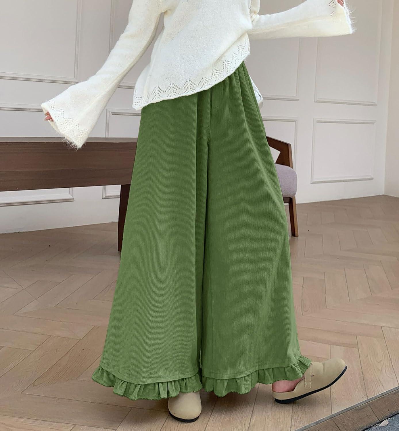 chouyatou Women’s Elastic Waist Corduroy Wide Leg Pants Flare Bell Bottom Long Palazzo Pants Culottes with Pockets(Light Green)