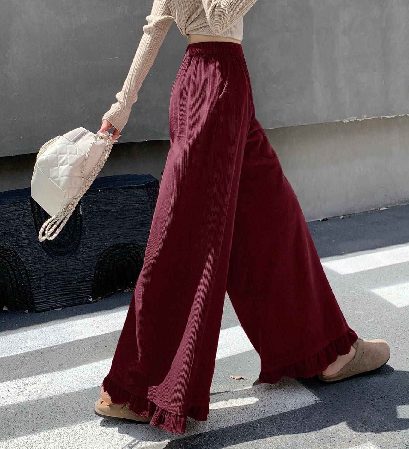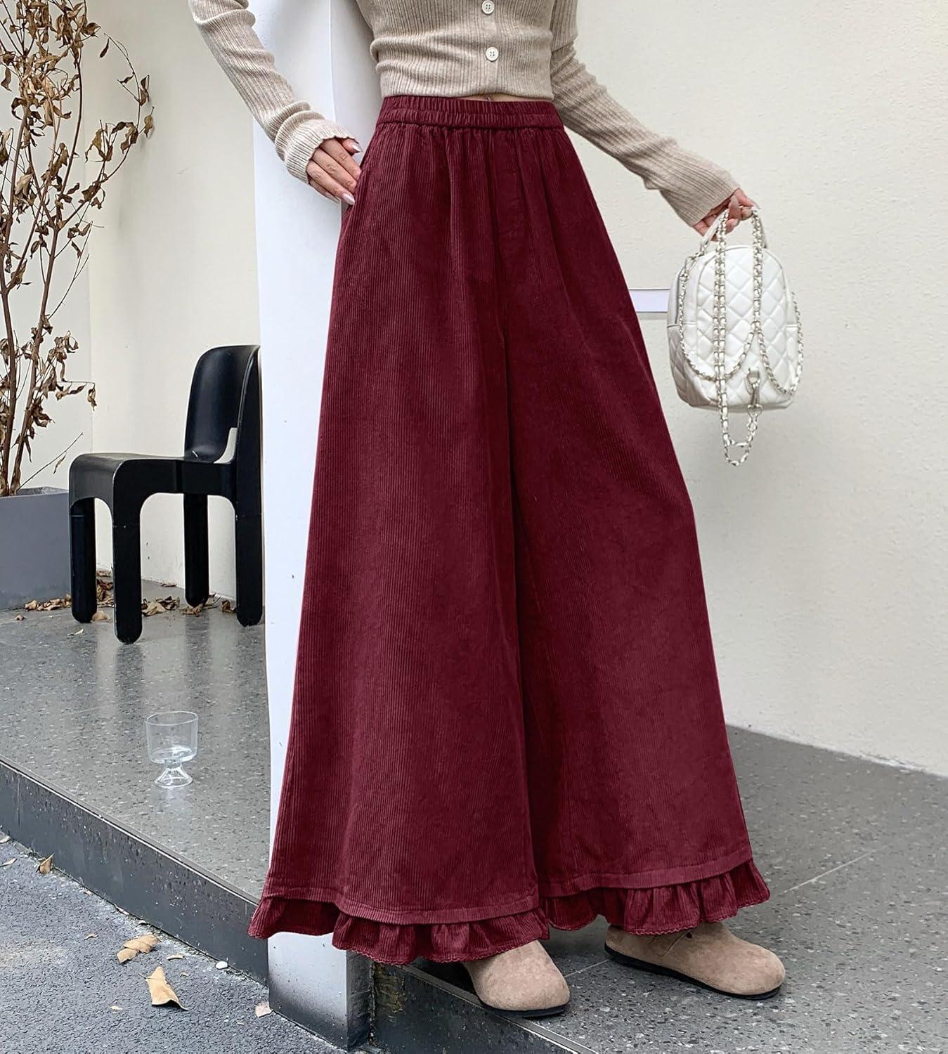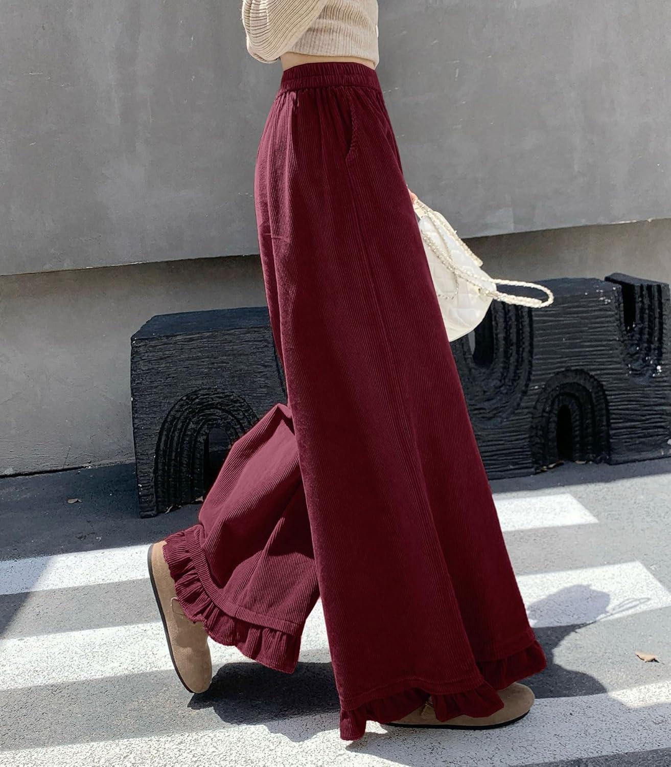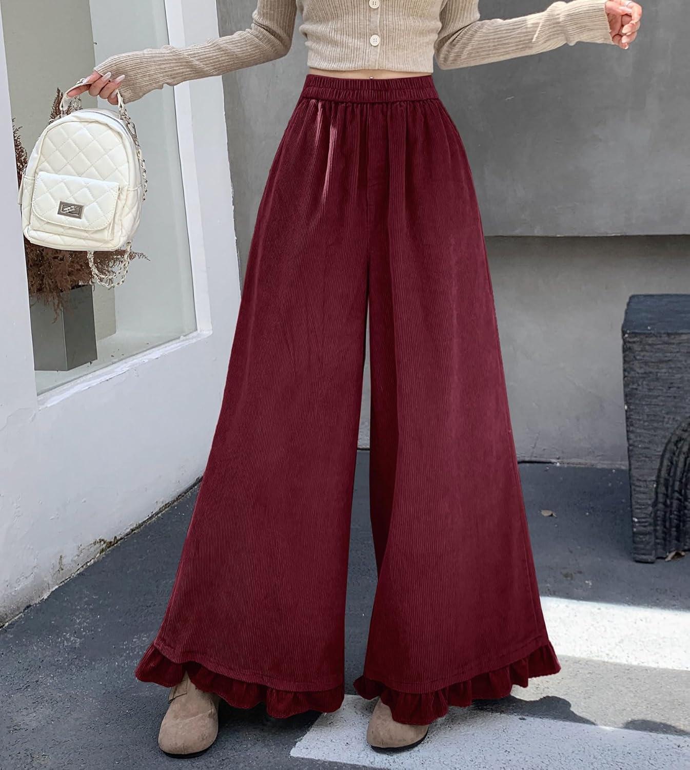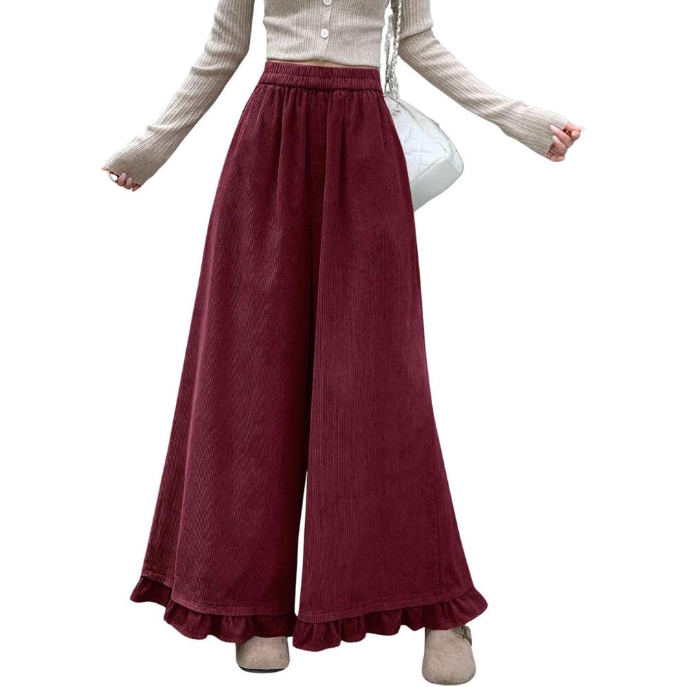 chouyatou Women’s Elastic Waist Corduroy Wide Leg Pants Flare Bell Bottom Long Palazzo Pants Culottes with Pockets(Wine Red)