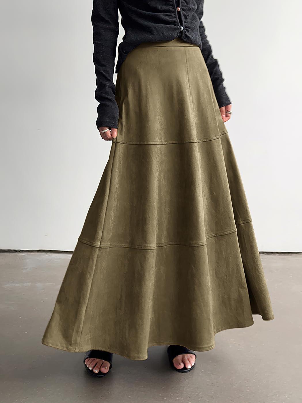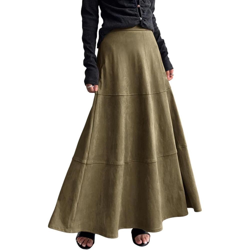 chouyatou Women's Elegant Ruffle Faux Suede Leather Skirt High Waisted A Line Fall Winter Maxi Long Skirt(Army Green)