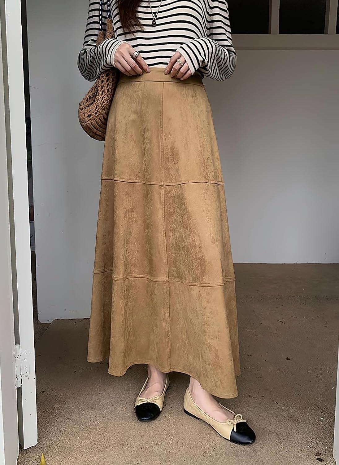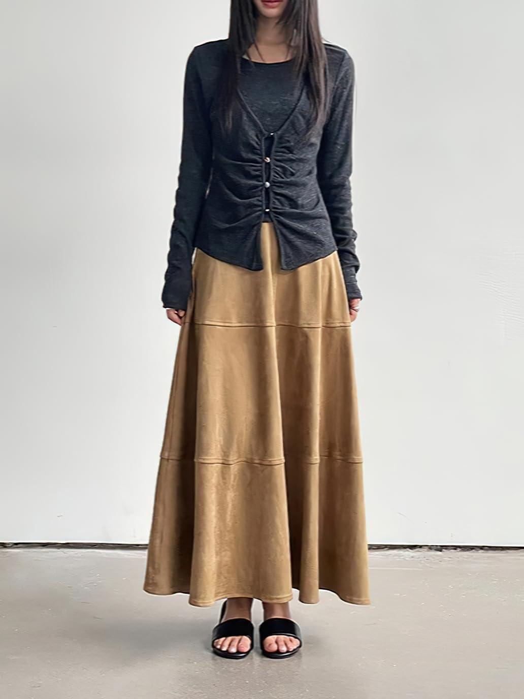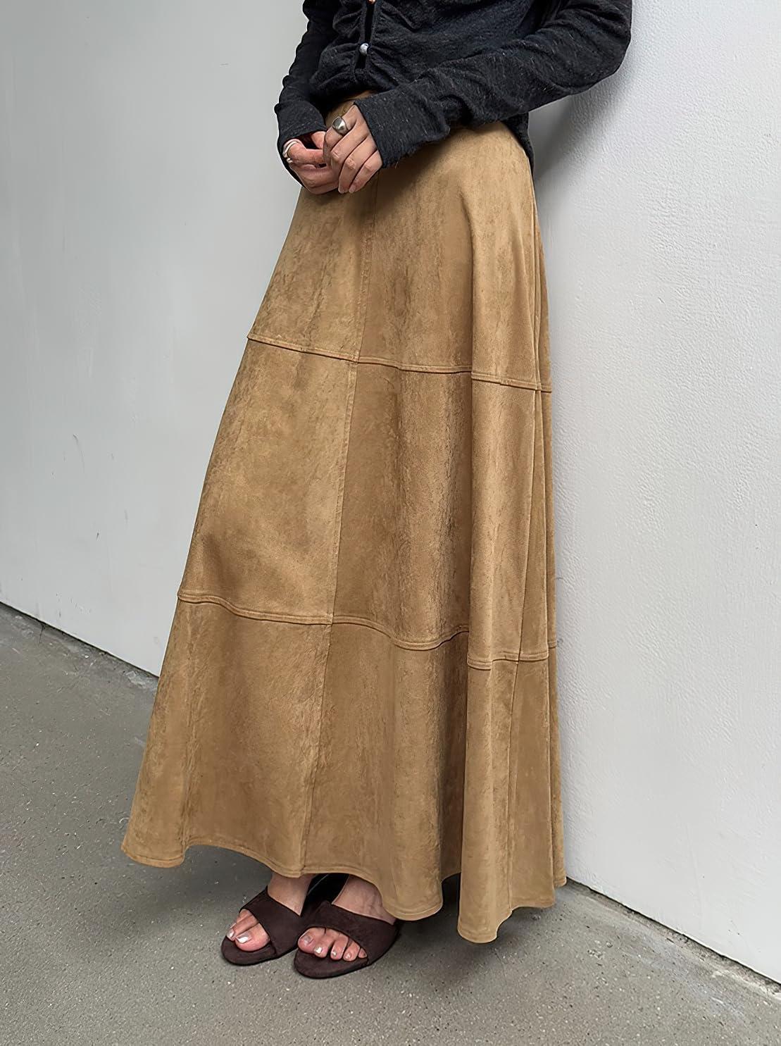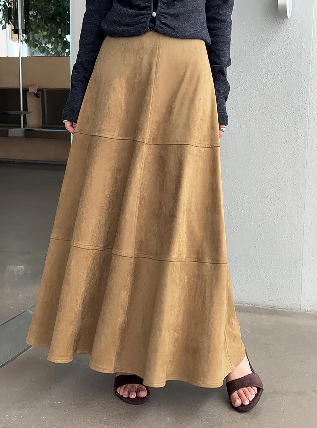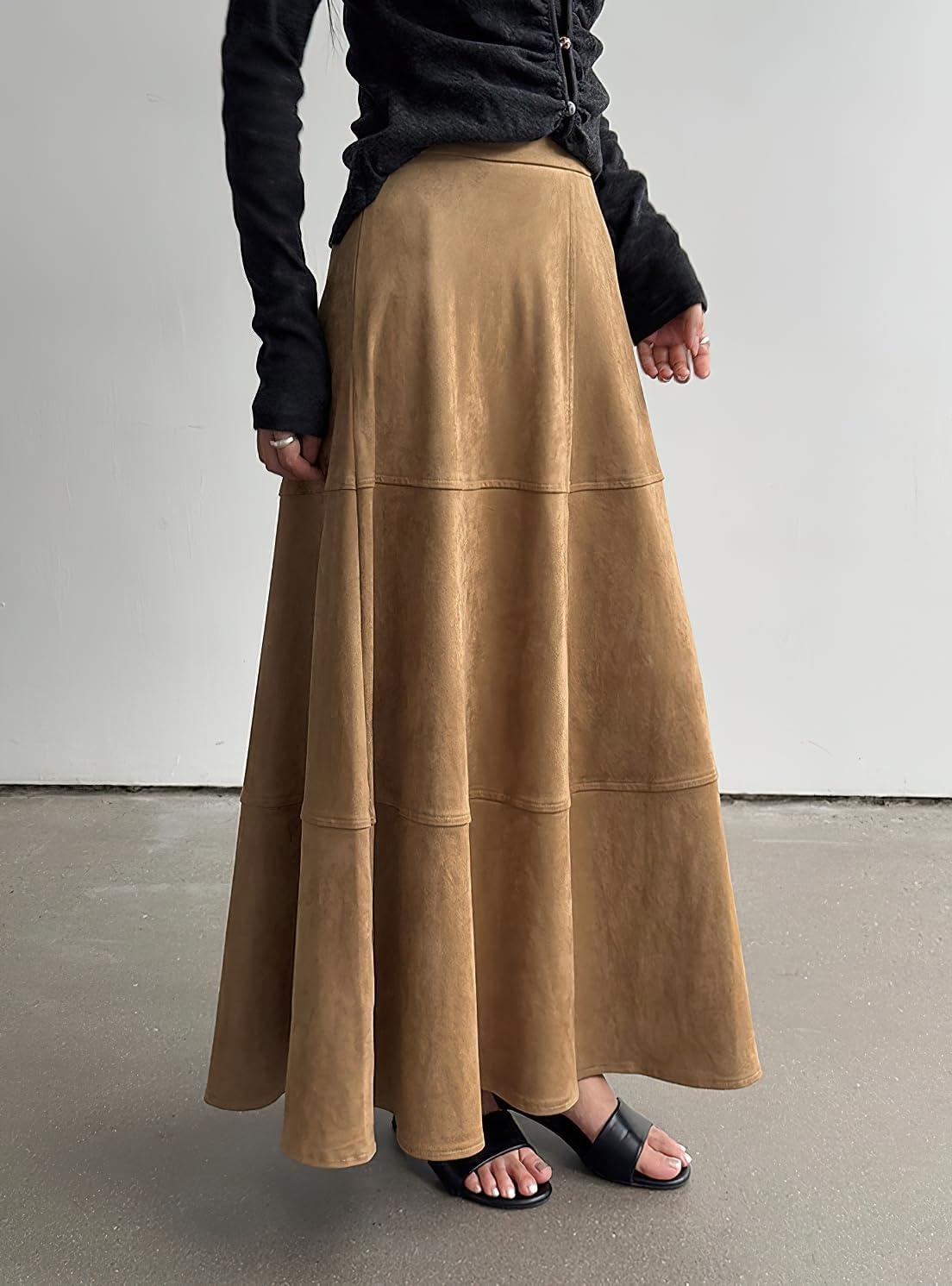 chouyatou Women's Elegant Ruffle Faux Suede Leather Skirt High Waisted A Line Fall Winter Maxi Long Skirt(Brown)