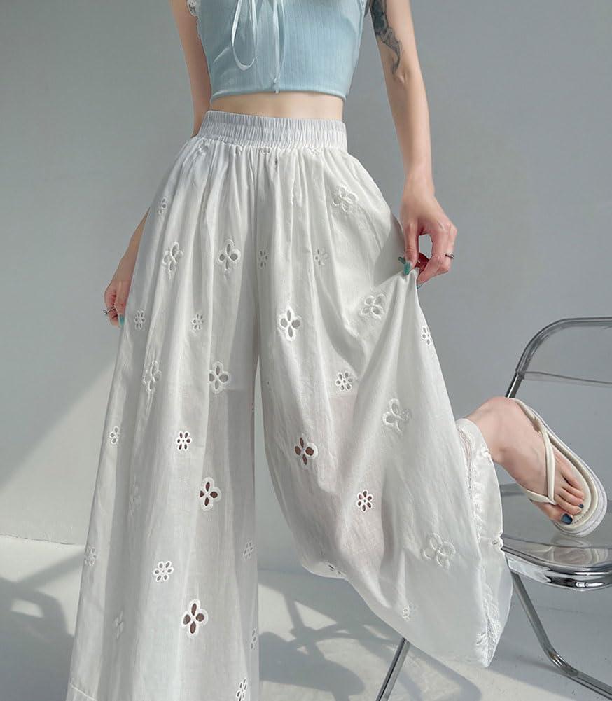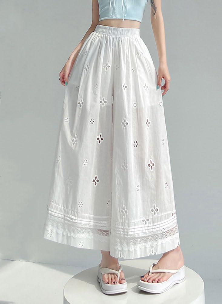 chouyatou Women’s Eyelet Embroidery Wide Leg Pants Elastic Waist Capri Palazzo Pants Baggy Culottes with Pockets(White)