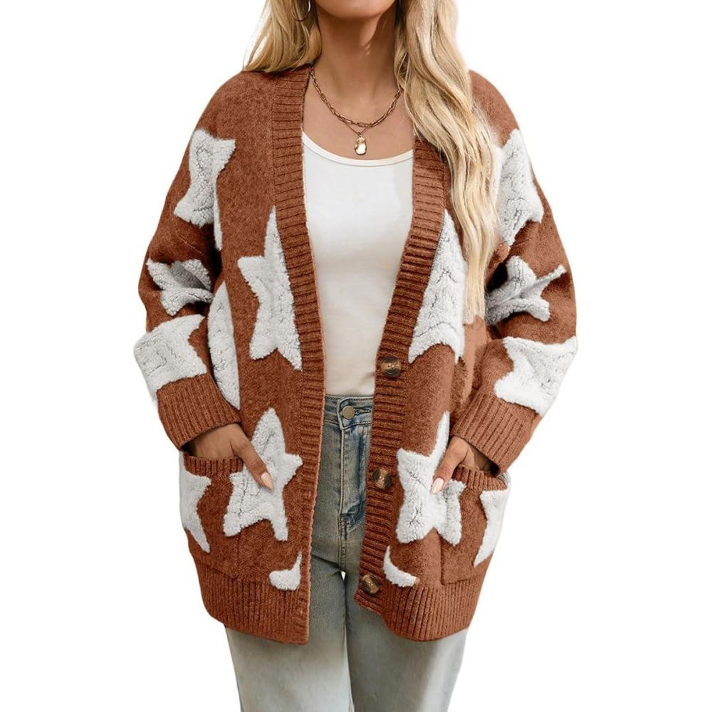 chouyatou Women's Fall 2025 Star Fleece Patchwork Cardigan Button Down Jacquard Chunky Knitted Sweater Coatigan(Brown)
