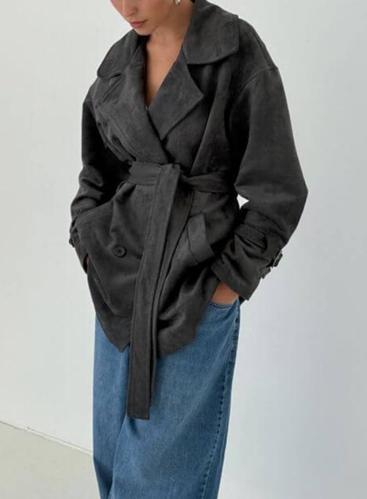 Be the first to review “chouyatou Women’s Fall Boyfriend Faux Suede Leather Jacket Notch Lapel Belted Midi Long Shacket Coat(Dark Grey)”