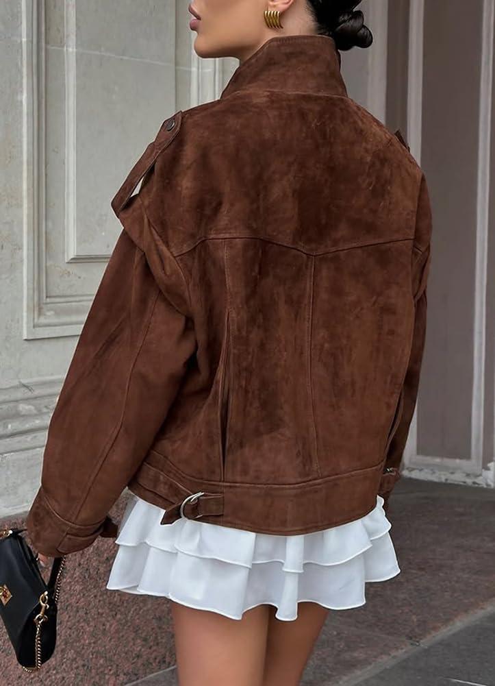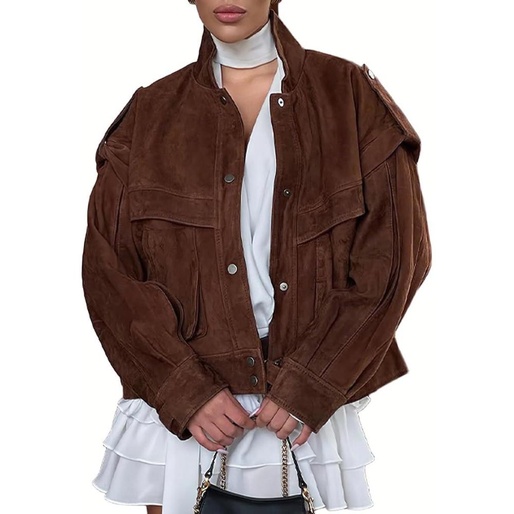 chouyatou Women’s Fall Boyfriend Faux Suede Leather Jacket Oversized Business Casual Button Down Coat(Brown)
