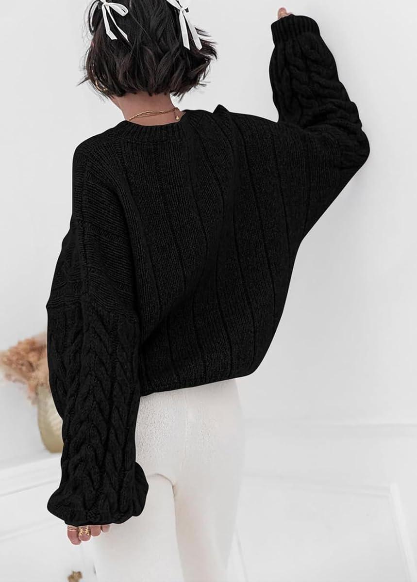 chouyatou Women's Fall Cable Knit Pullover Sweater Crewneck Loose Chunky Sweater Jumper Tops(Black)
