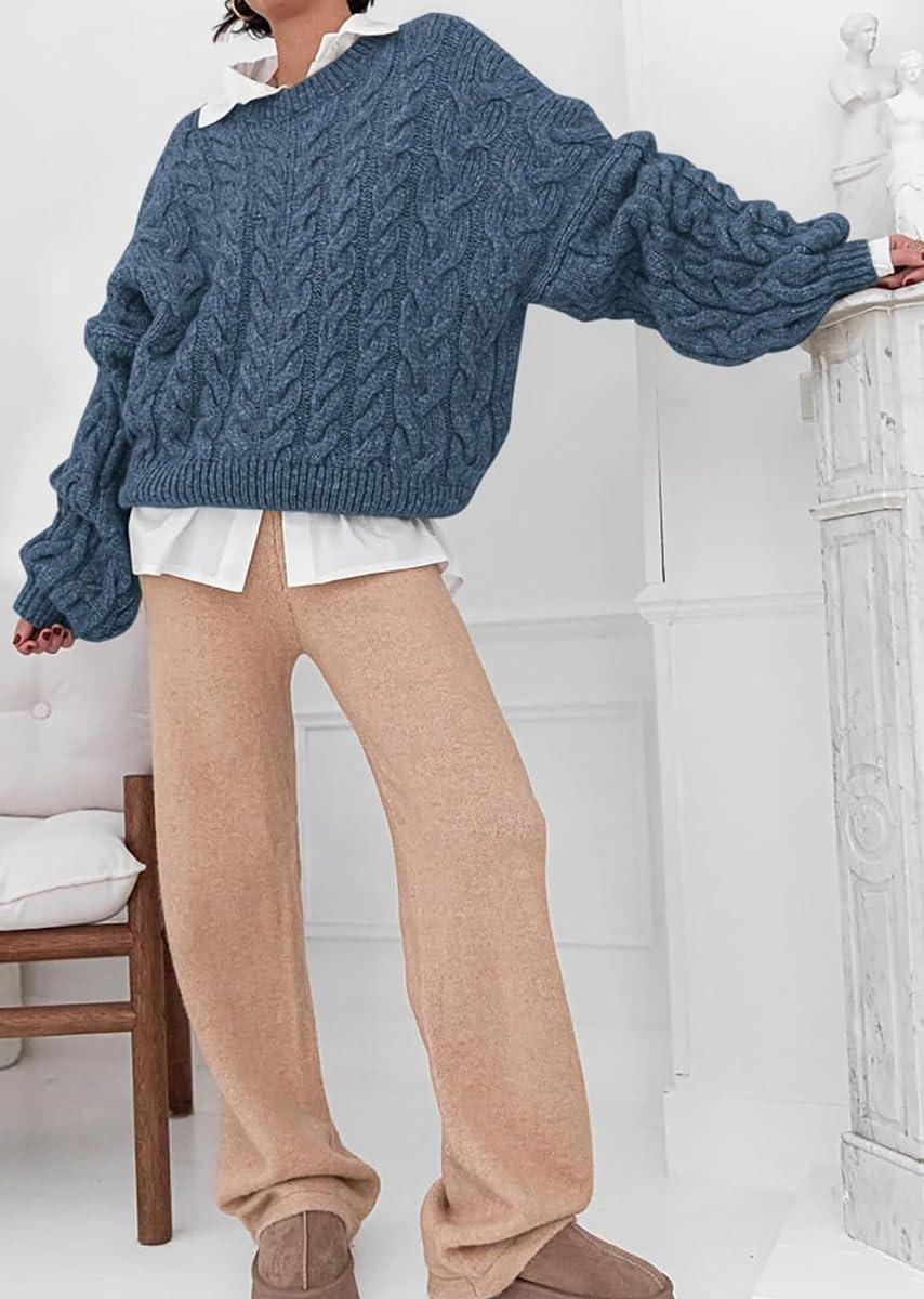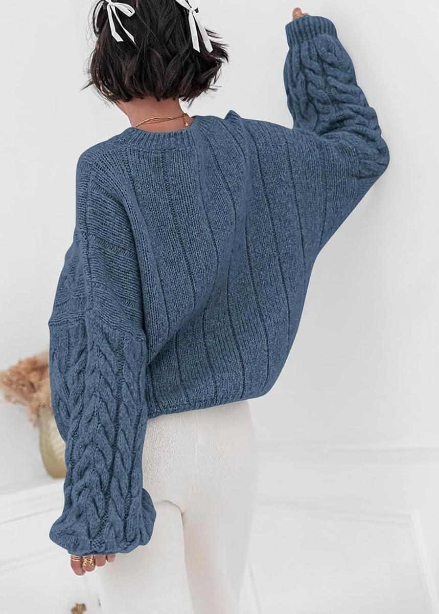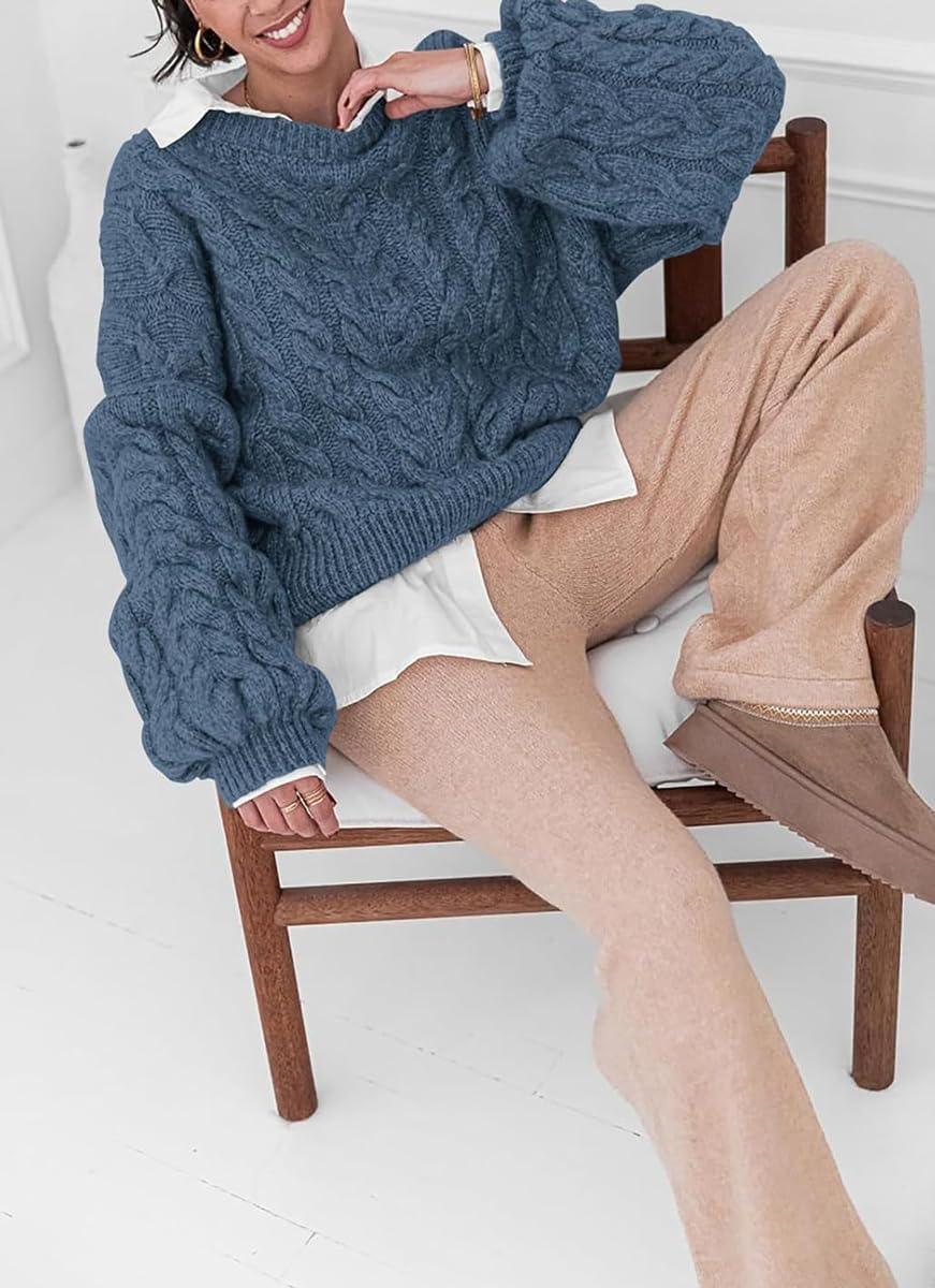 chouyatou Women's Fall Cable Knit Pullover Sweater Crewneck Loose Chunky Sweater Jumper Tops(Blue)