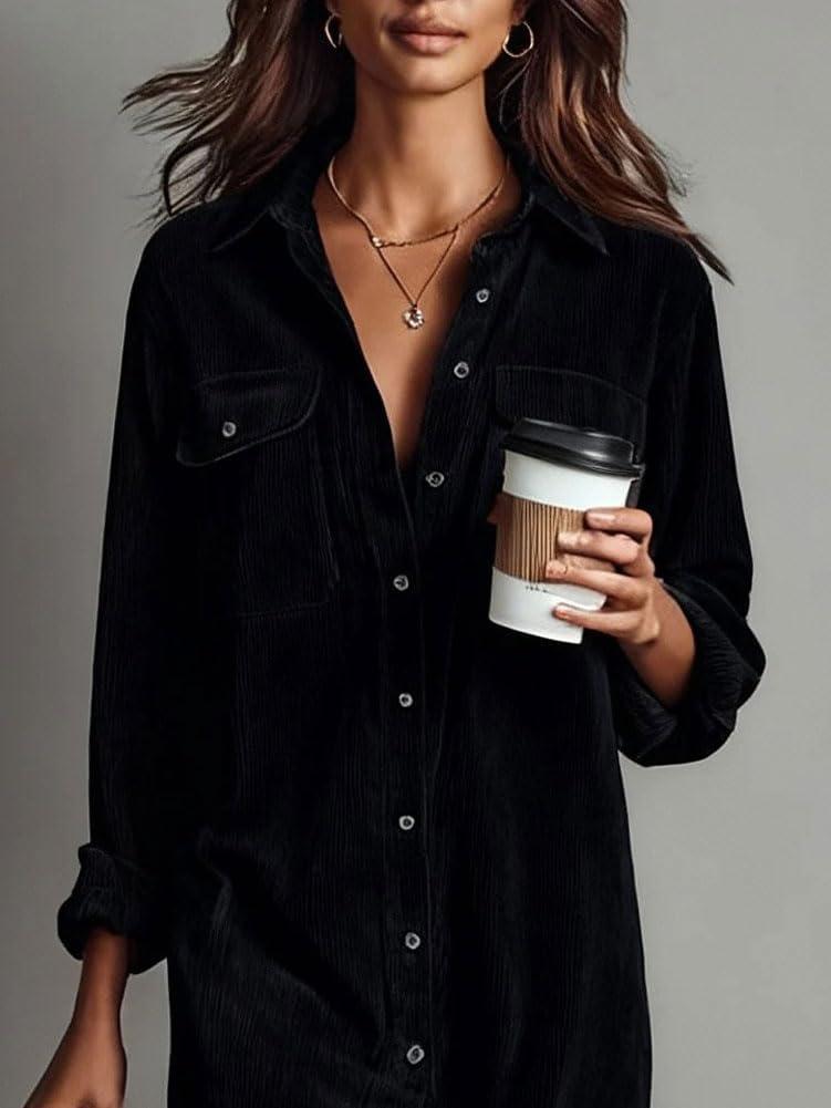 imagechouyatou Womens Fall Corduroy Button Down Shirt Dress Casual Lapel a Line Pleated Tunic Shift Midi Long DressBlack