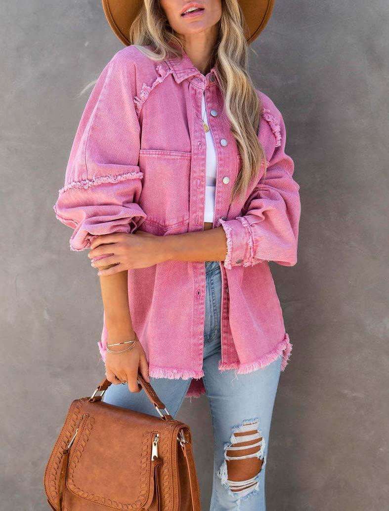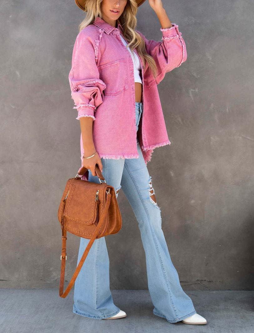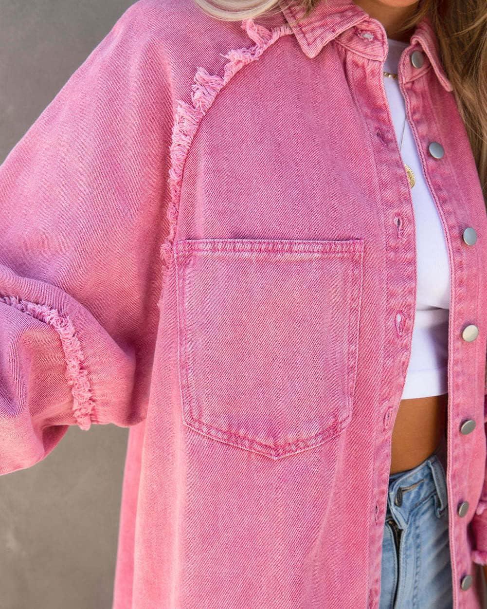 chouyatou Women’s Fall Oversized Jean Jacket Casual Button Down Denim Shacket Jacket(Hot Pink)