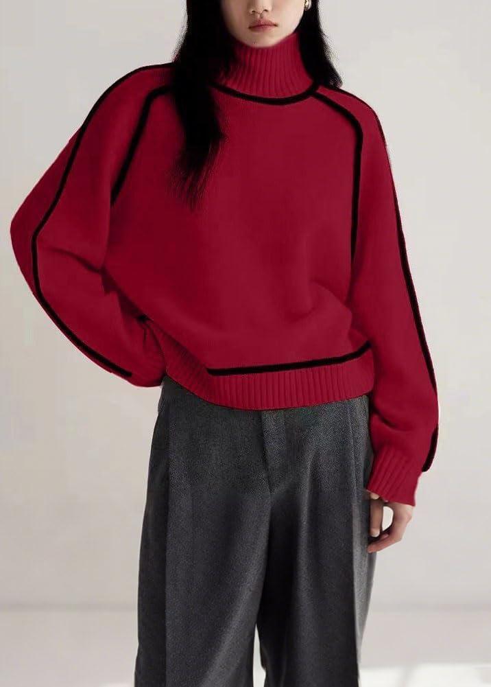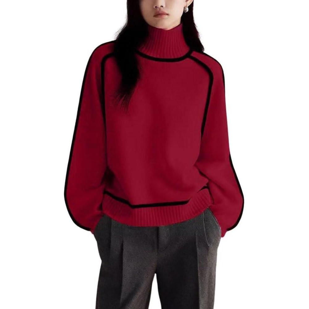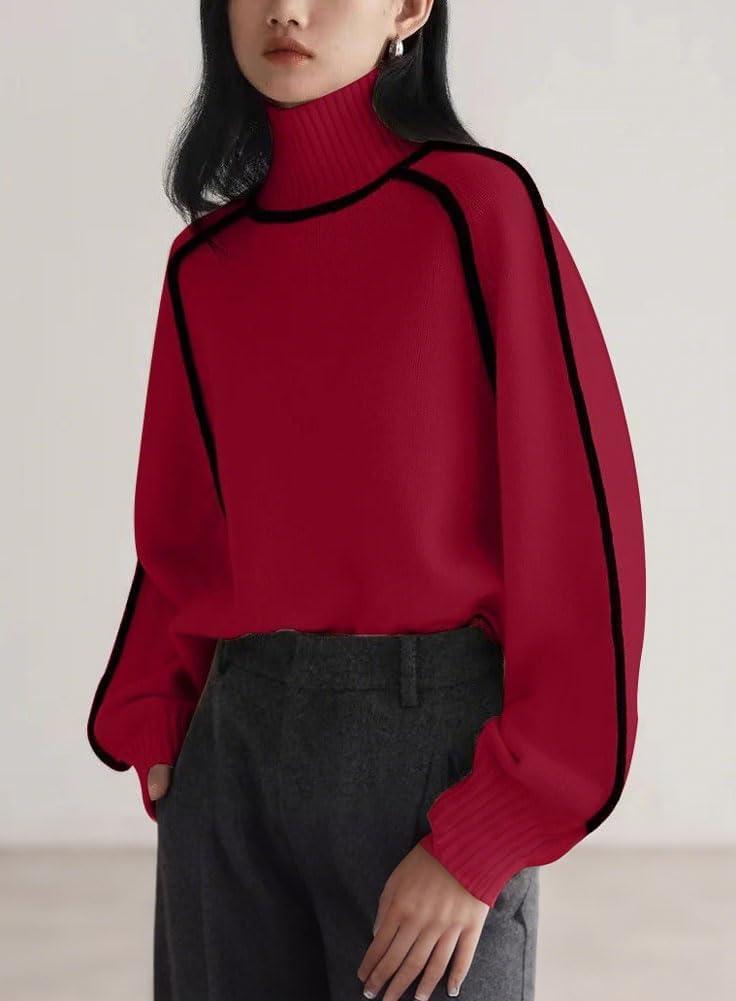 chouyatou Women's Fall Turtleneck Sweater Contrast Ribbed Knit Jumper Pullover Tops Casual Loose Knitwear(Red)