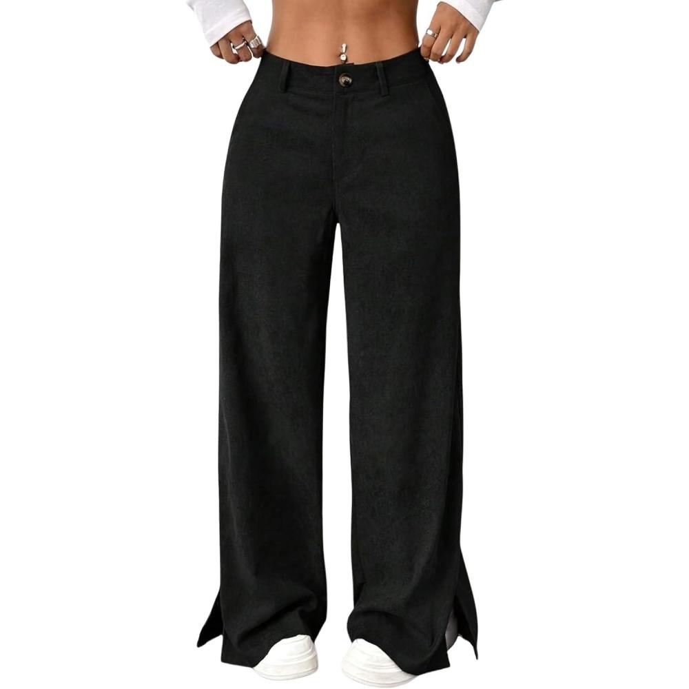 chouyatou Women’s Fall Winter Corduroy Wide Leg Pants Side Split High Waisted Palazzo Trousers(Black)