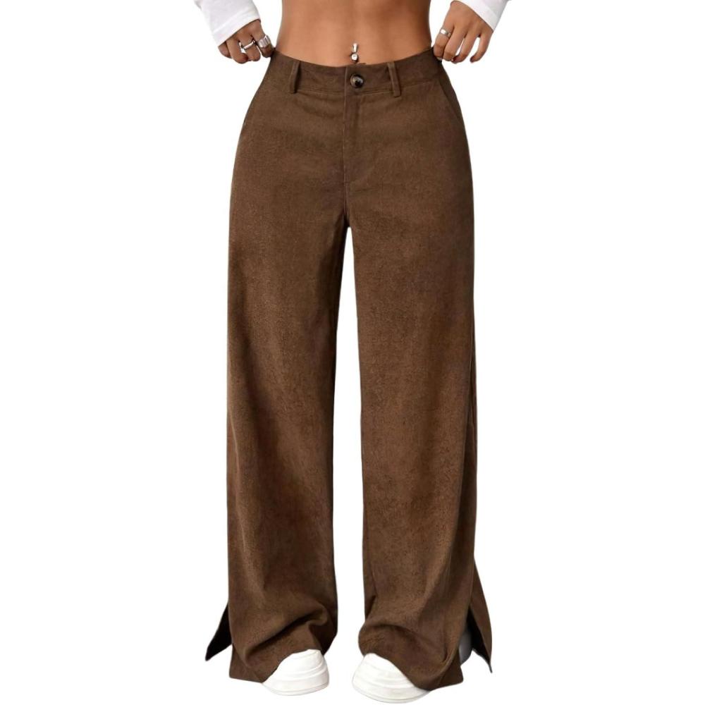 chouyatou Women’s Fall Winter Corduroy Wide Leg Pants Side Split High Waisted Palazzo Trousers(Dark Brown)