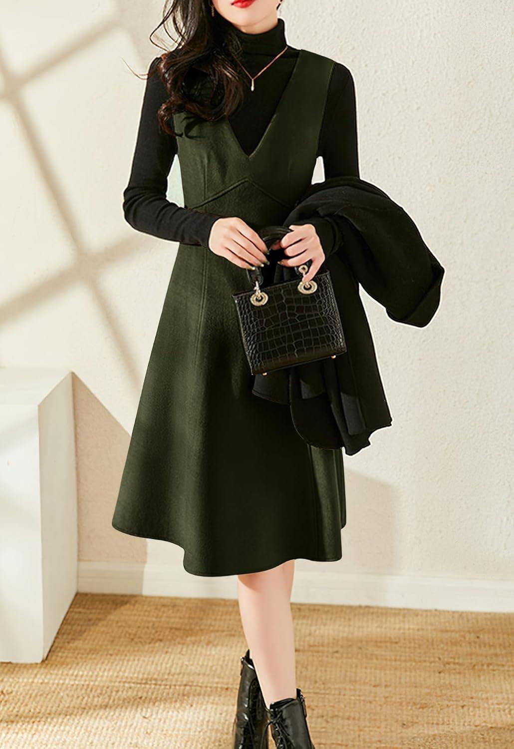 chouyatou Women’s Fall Winter Wool Tank Dress Overall A Line Flare Pinafore Zip Up Dressy Midi Jumper Dress(Green)