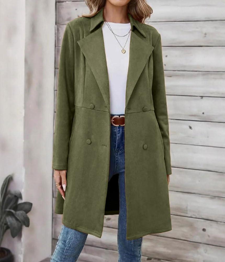 chouyatou Women's Faux Suede Leather Mid Long Trench Coat Double Breasted Dressy Casual Blazer Peacoat Jacket(Army Green)