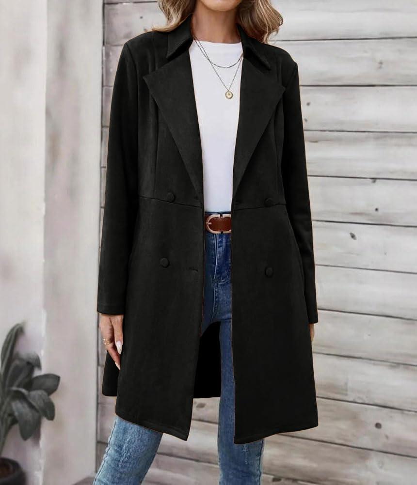 chouyatou Women's Faux Suede Leather Mid Long Trench Coat Double Breasted Dressy Casual Blazer Peacoat Jacket(Black)