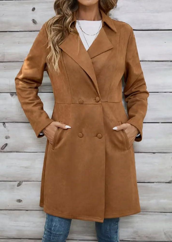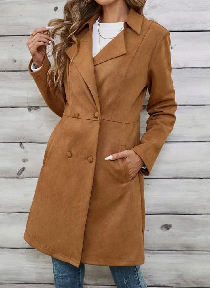 imagechouyatou Womens Faux Suede Leather Mid Long Trench Coat Double Breasted Dressy Casual Blazer Peacoat JacketCoffee