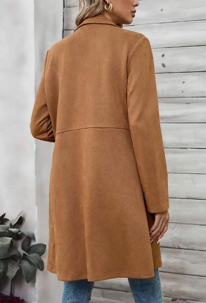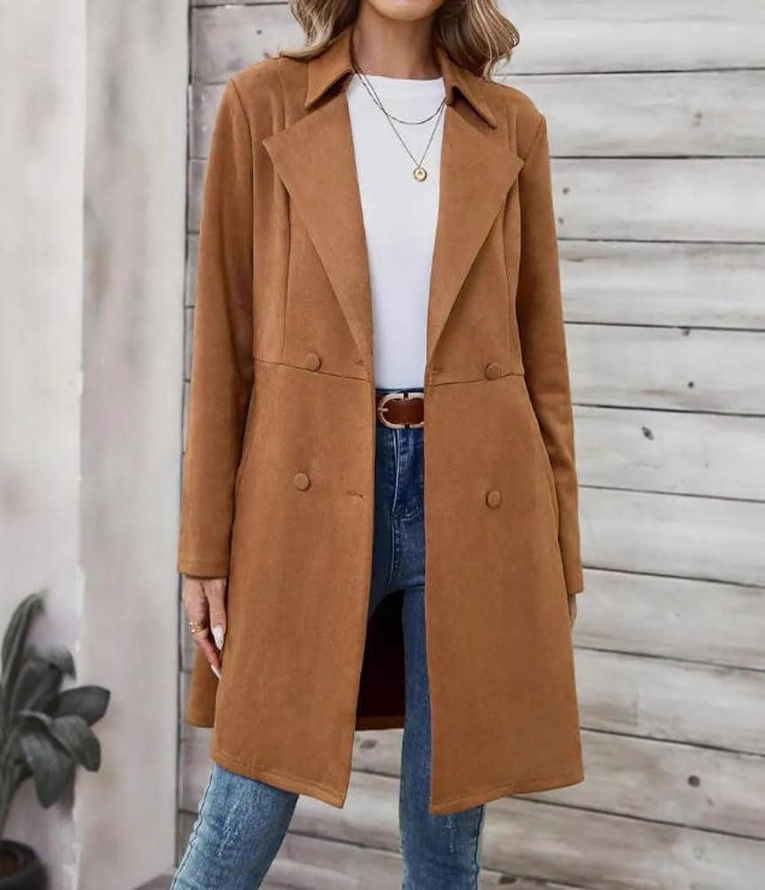 chouyatou Women’s Faux Suede Leather Mid Long Trench Coat Double Breasted Dressy Casual Blazer Peacoat Jacket(Coffee)