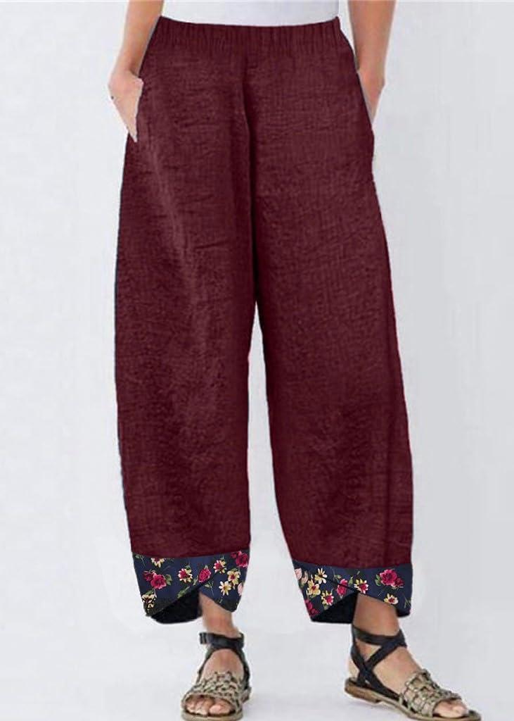 imagechouyatou Womens Floral Printed Cotton Linen Crop Pants Baggy Elastic Waist Wide Leg Palazzo TrousersBurgundy