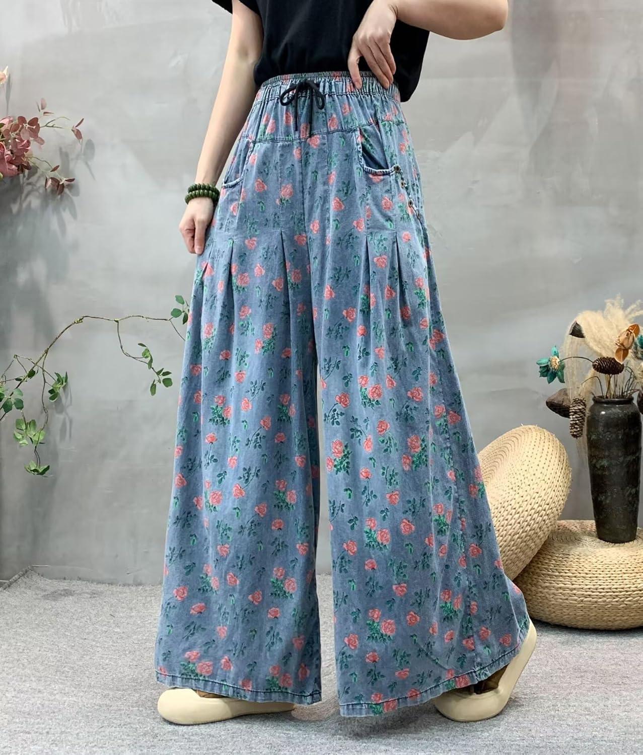 chouyatou Women's Floral Wide Leg Denim Pants Adjustable Drawstring Baggy Elastic Waist Culotte Jeans(Blue)