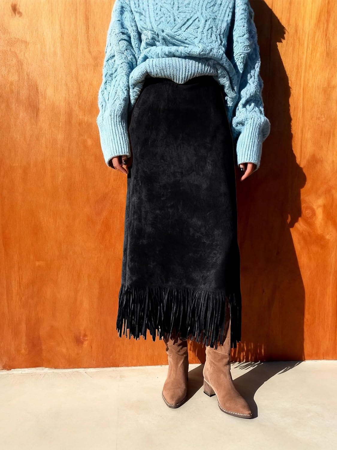 chouyatou Women’s Fringe Trim Faux Suede Skirt High Waisted Pencil Dressy Fall Winter Midi Long Skirt(Black)