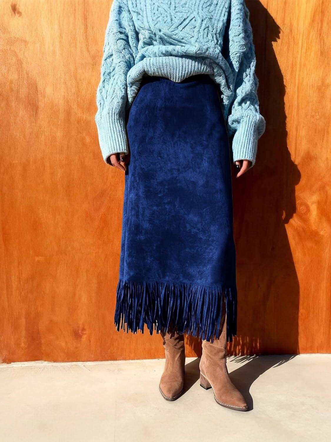 chouyatou Women’s Fringe Trim Faux Suede Skirt High Waisted Pencil Dressy Fall Winter Midi Long Skirt(Blue)