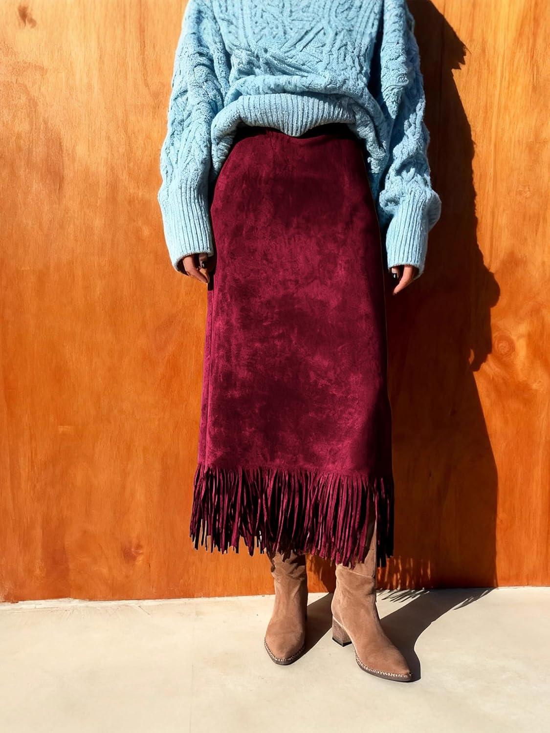 Be the first to review “chouyatou Women’s Fringe Trim Faux Suede Skirt High Waisted Pencil Dressy Fall Winter Midi Long Skirt(Red)”
