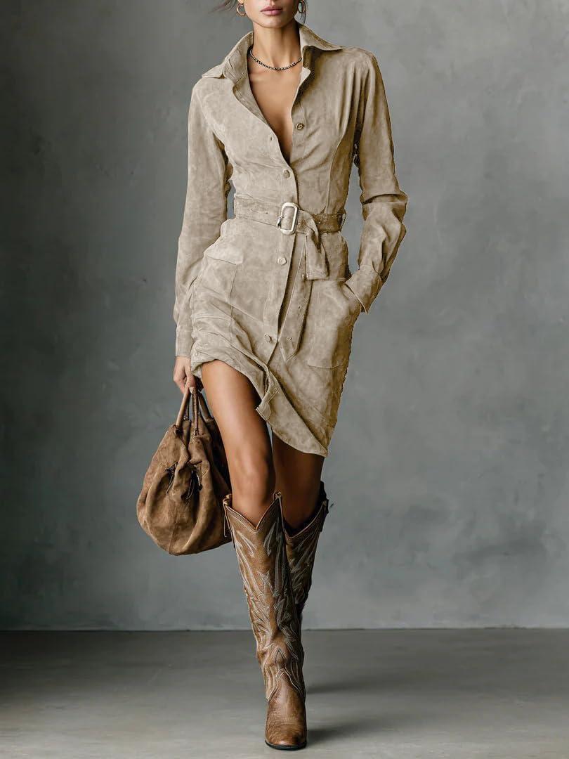 imagechouyatou Womens Long Sleeve Faux Suede Shirt Dress Casual Lapel Button Down Tunic Shift Mini Dresses with BeltApricot