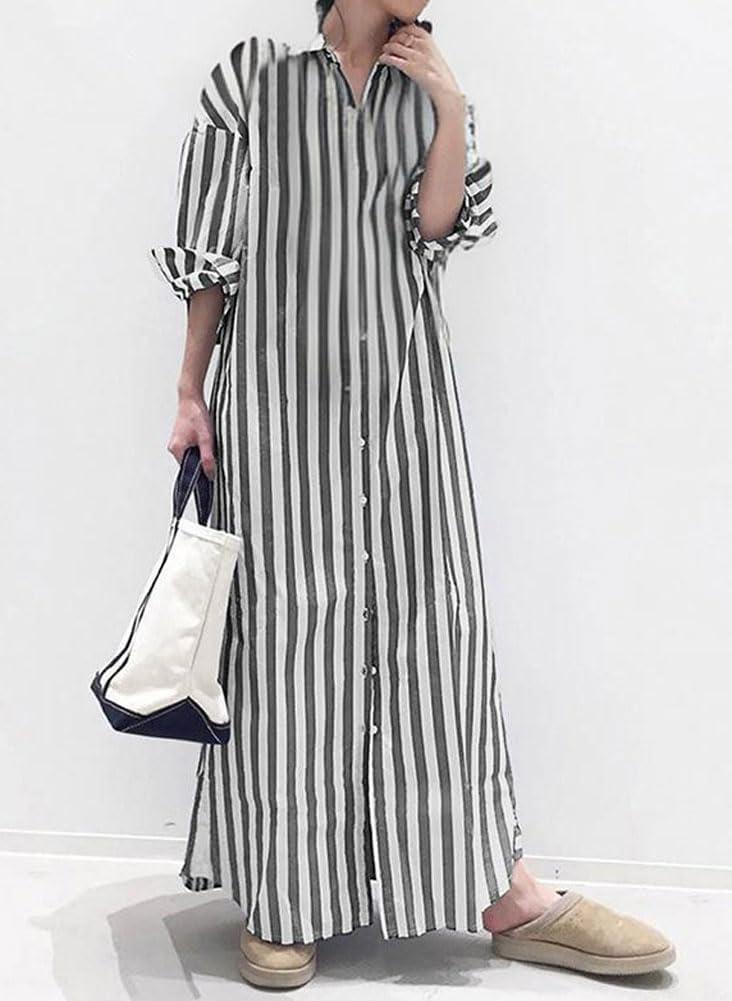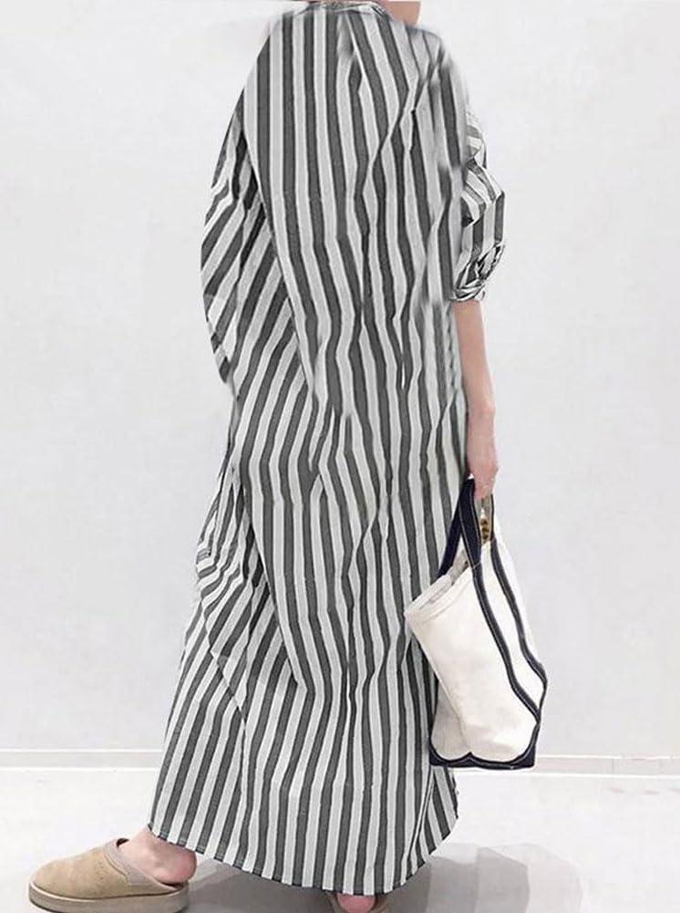 imagechouyatou Womens Long Sleeve Striped Shirt Dress Business Casual Beach Maxi Long Button Down DressBlack