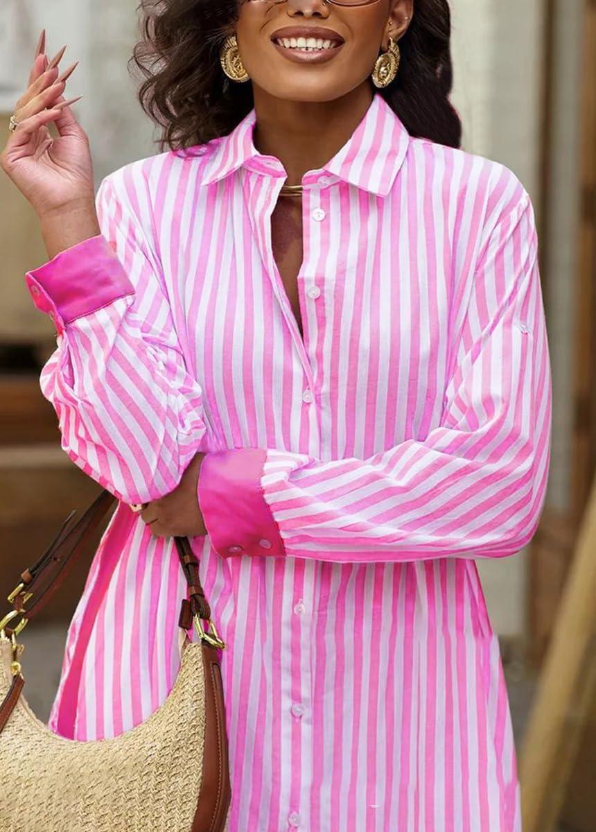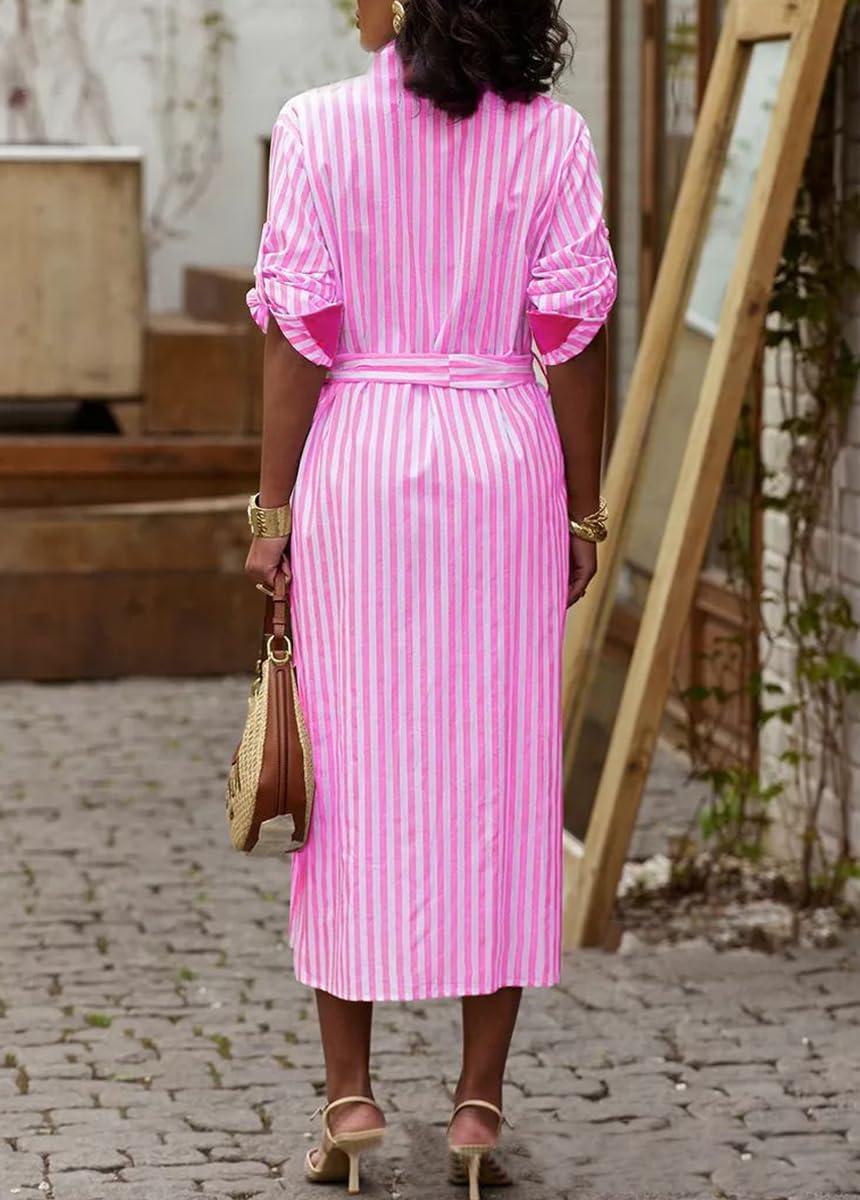 chouyatou Women's Long Sleeve Striped Shirt Dress Casual Button Down Midi Long Beach Dress with Belt(Pink)