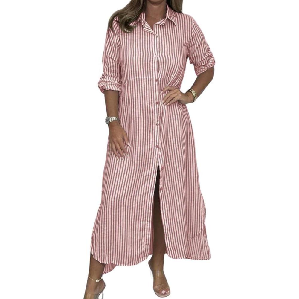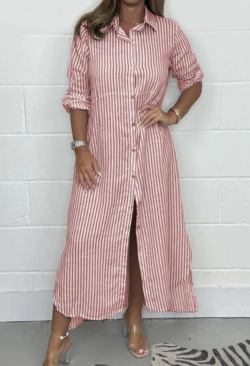 imagechouyatou Womens Long Sleeve Striped Shirt Dress Casual Loose Button Down Maxi Long Tunic DressPink
