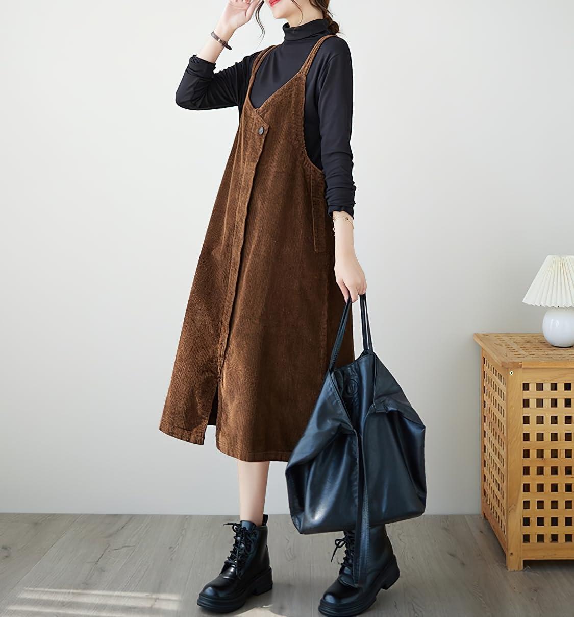 chouyatou Women's Loose Corduroy Spaghetti Strap Overall Dress A Line Flare Pinafore Midi Jumper Dress(Brown)
