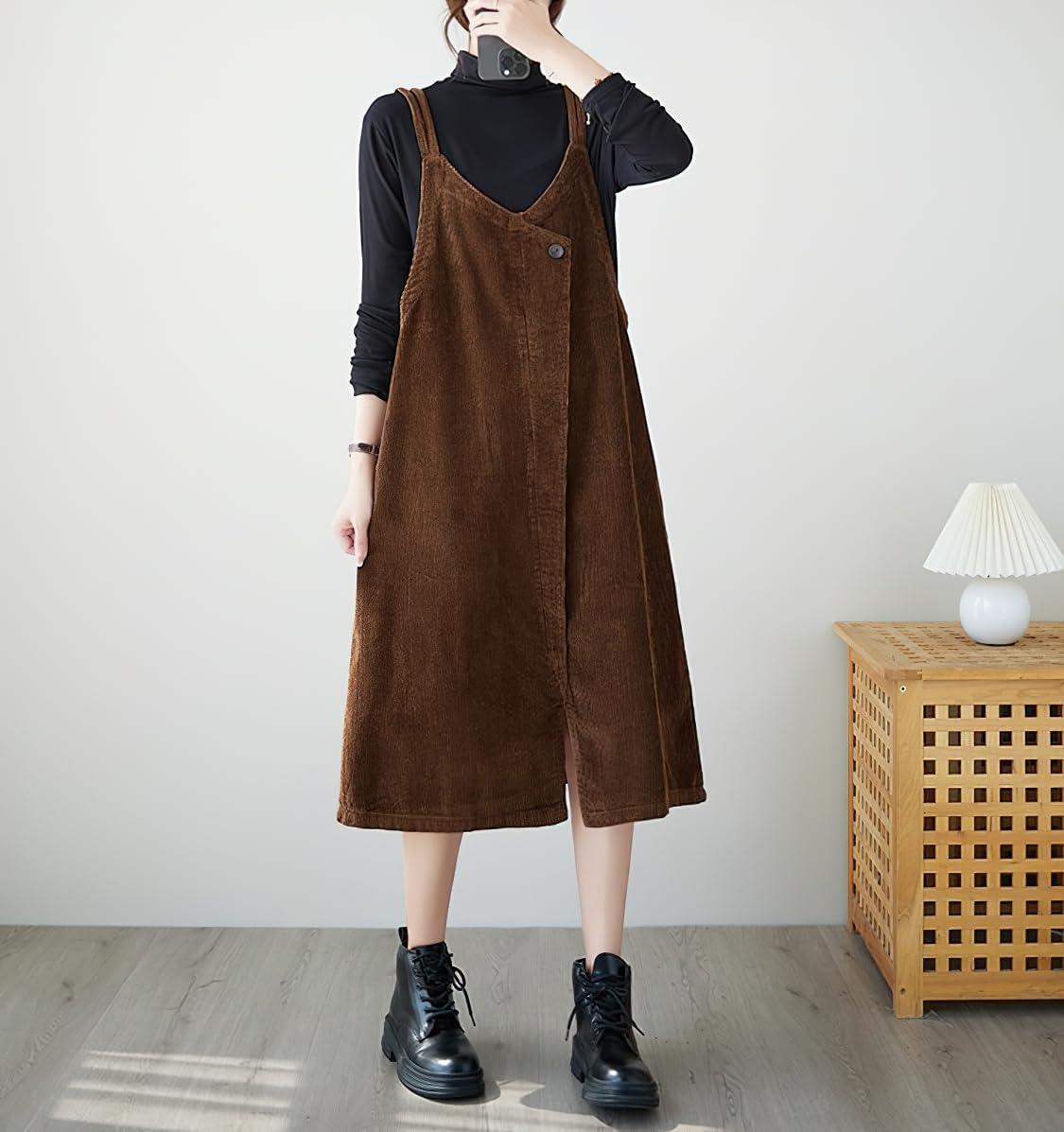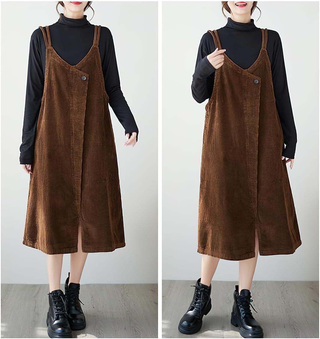 chouyatou Women’s Loose Corduroy Spaghetti Strap Overall Dress A Line Flare Pinafore Midi Jumper Dress(Brown)