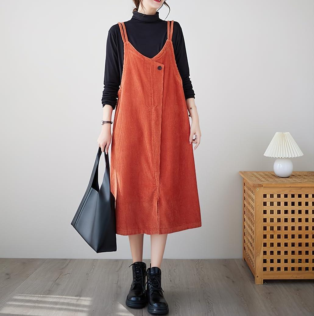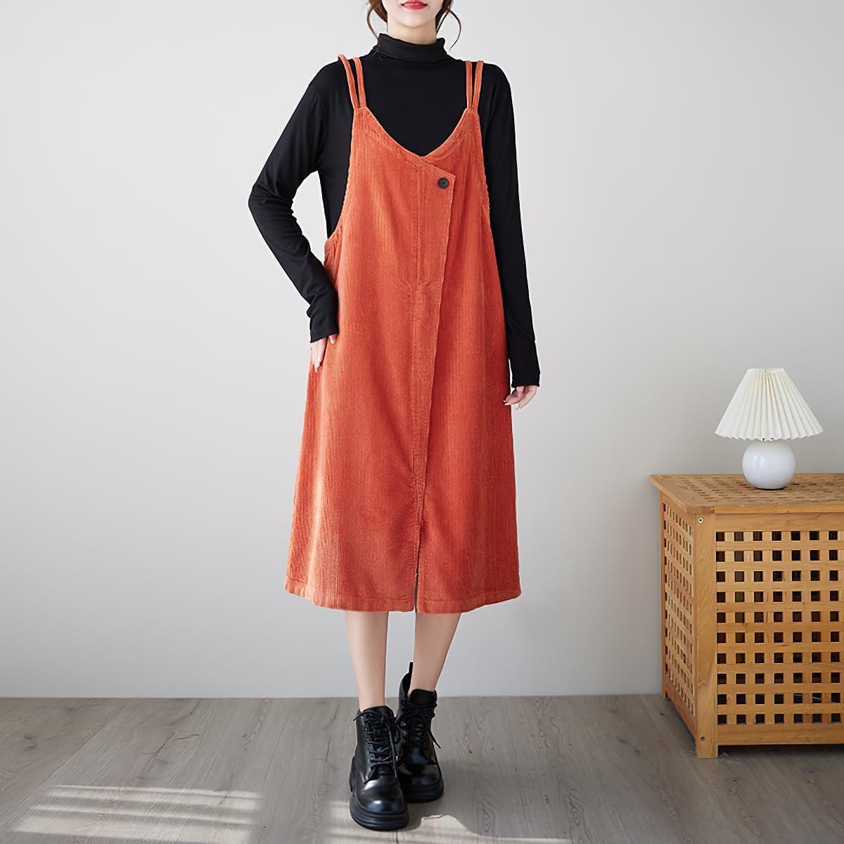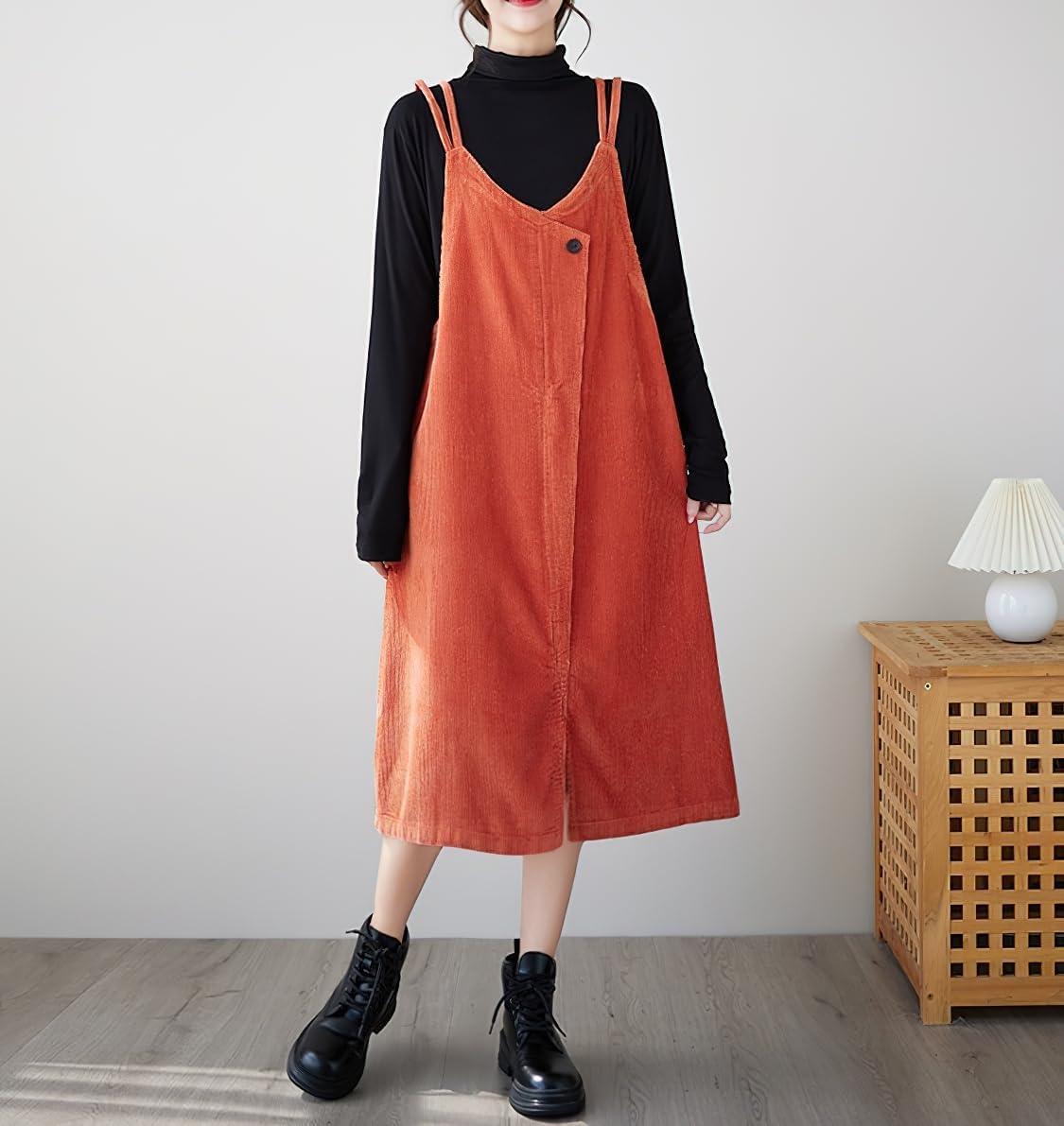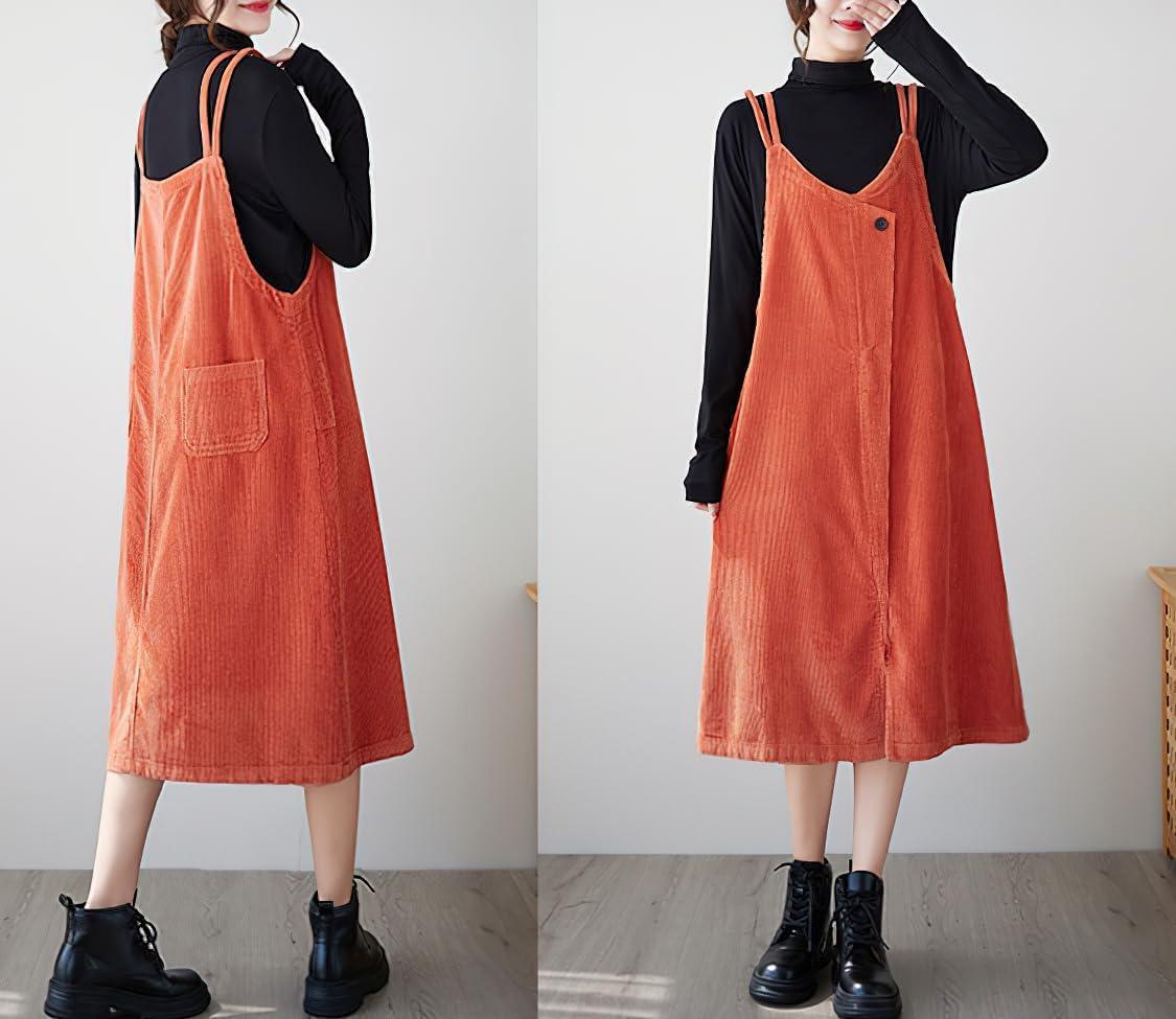 chouyatou Women’s Loose Corduroy Spaghetti Strap Overall Dress A Line Flare Pinafore Midi Jumper Dress(Orange)