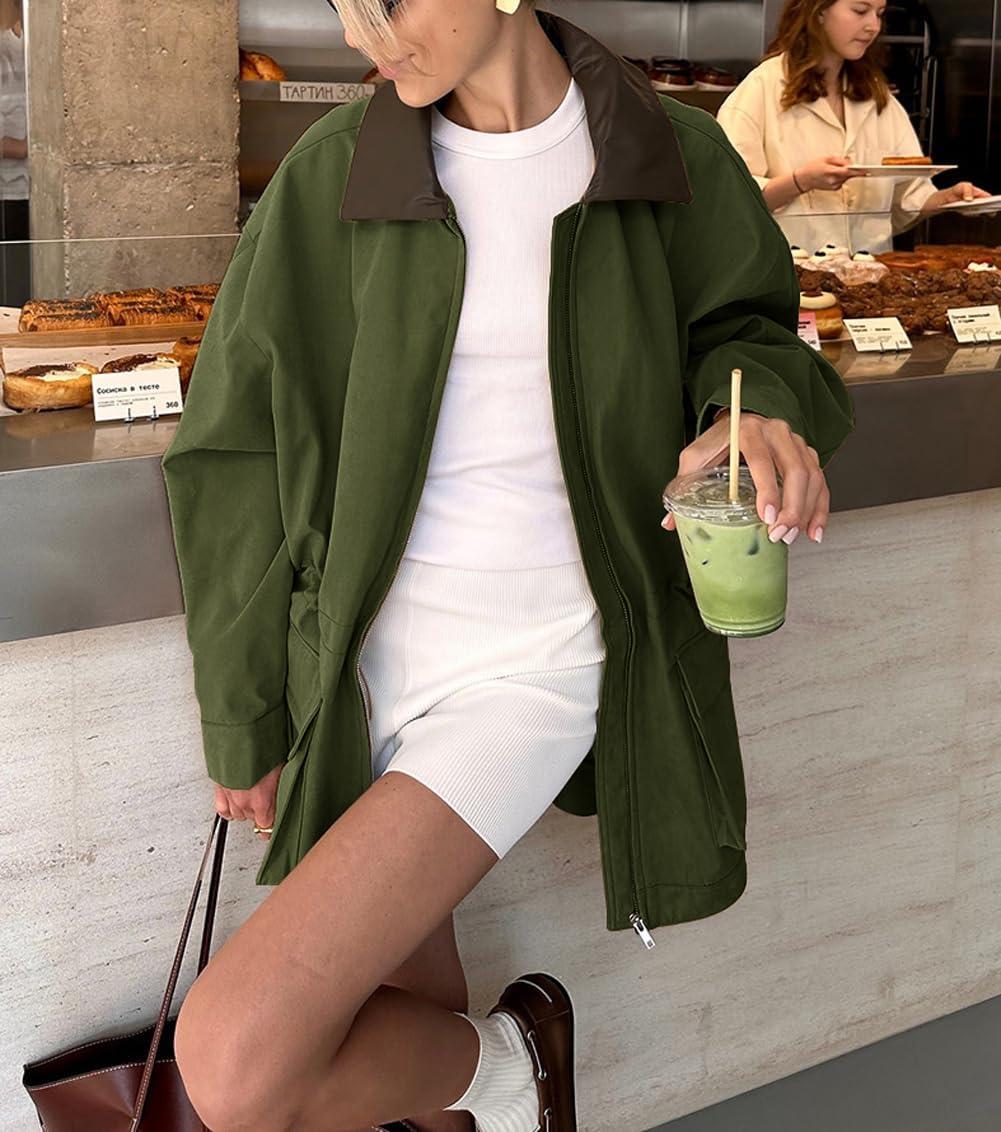 chouyatou Women’s Oversized Fall Barn Jacket Lightweight Zip Up Cotton Utility Jacket Casual Trench Coat(Army Green)