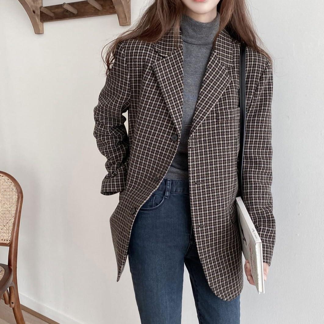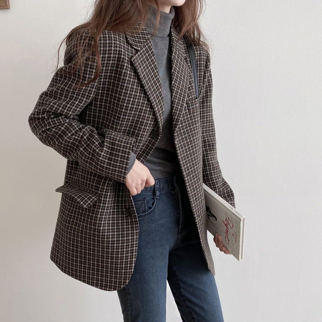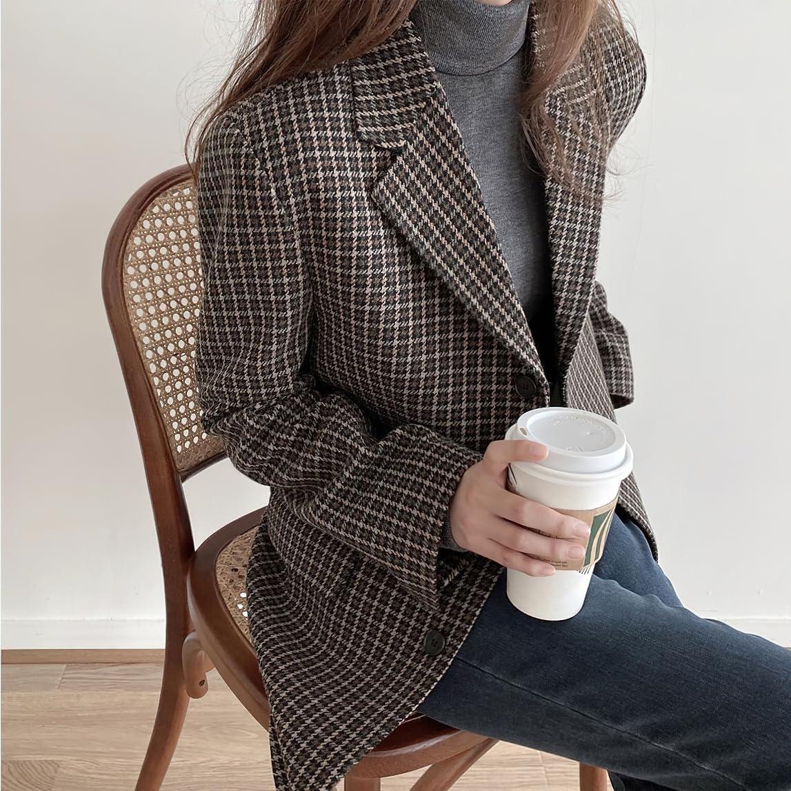 chouyatou Women's Plaid Fall Winter Business Casual Wool Blazer Jacket Single Breasted Dressy Work Coat(Coffee)
