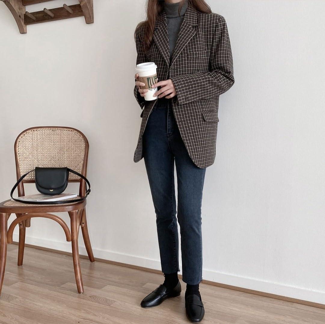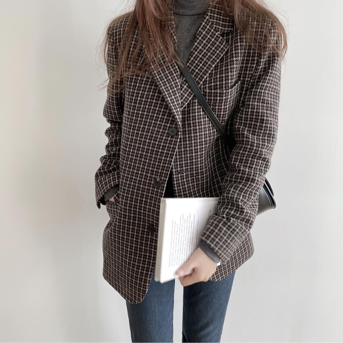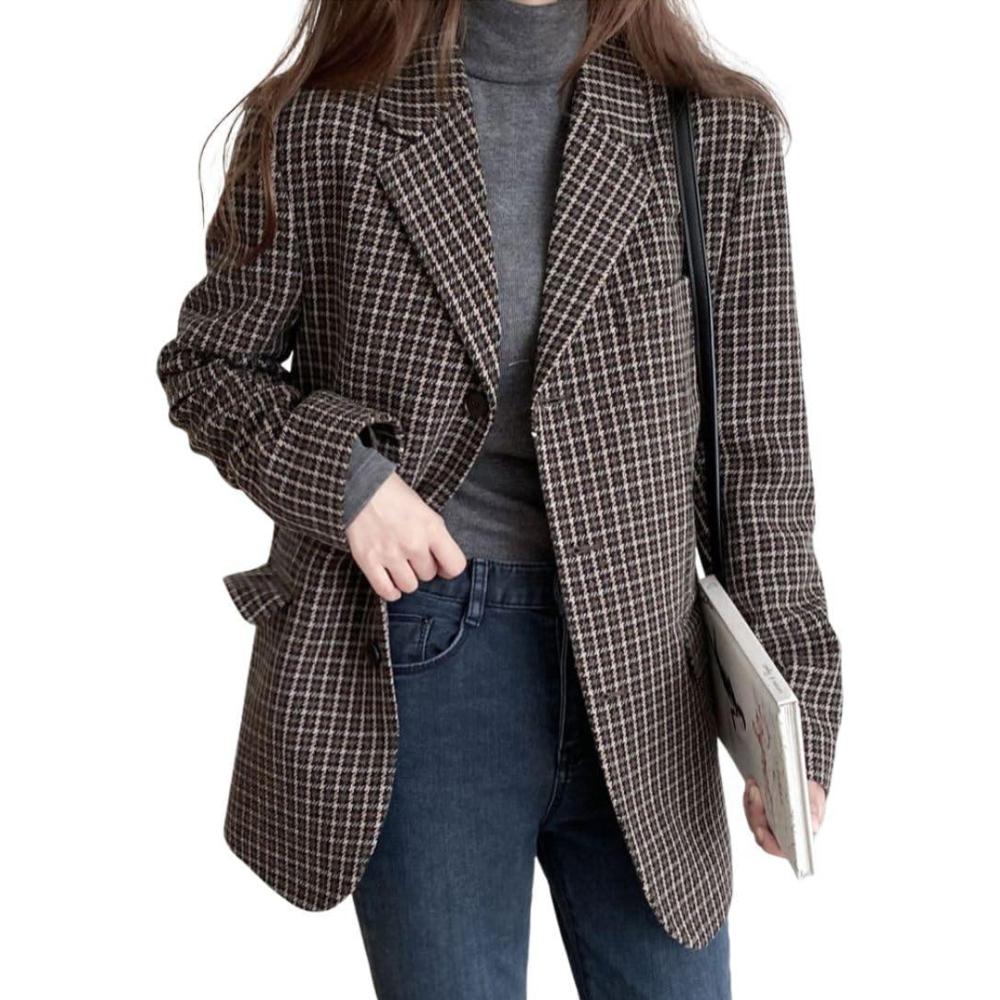 chouyatou Women’s Plaid Fall Winter Business Casual Wool Blazer Jacket Single Breasted Dressy Work Coat(Coffee)