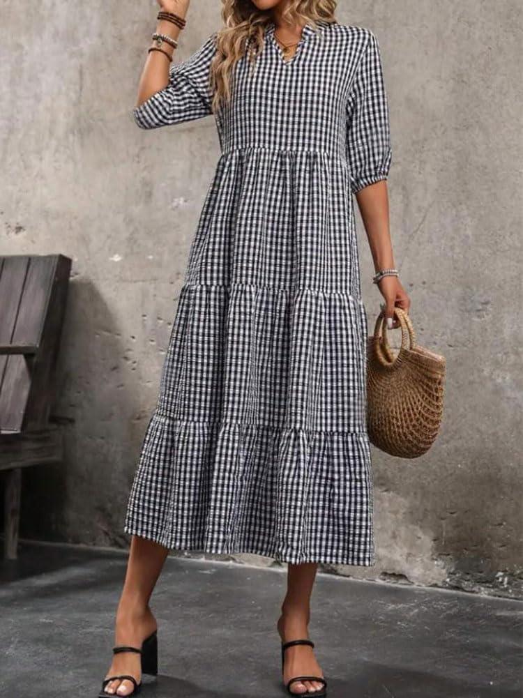 Be the first to review “chouyatou Women’s Retro Plaid Ruffle Hem Dress Puff Lantern Sleeve Notch Neck Gingham Tiered Midi Long Dress(Black)”
