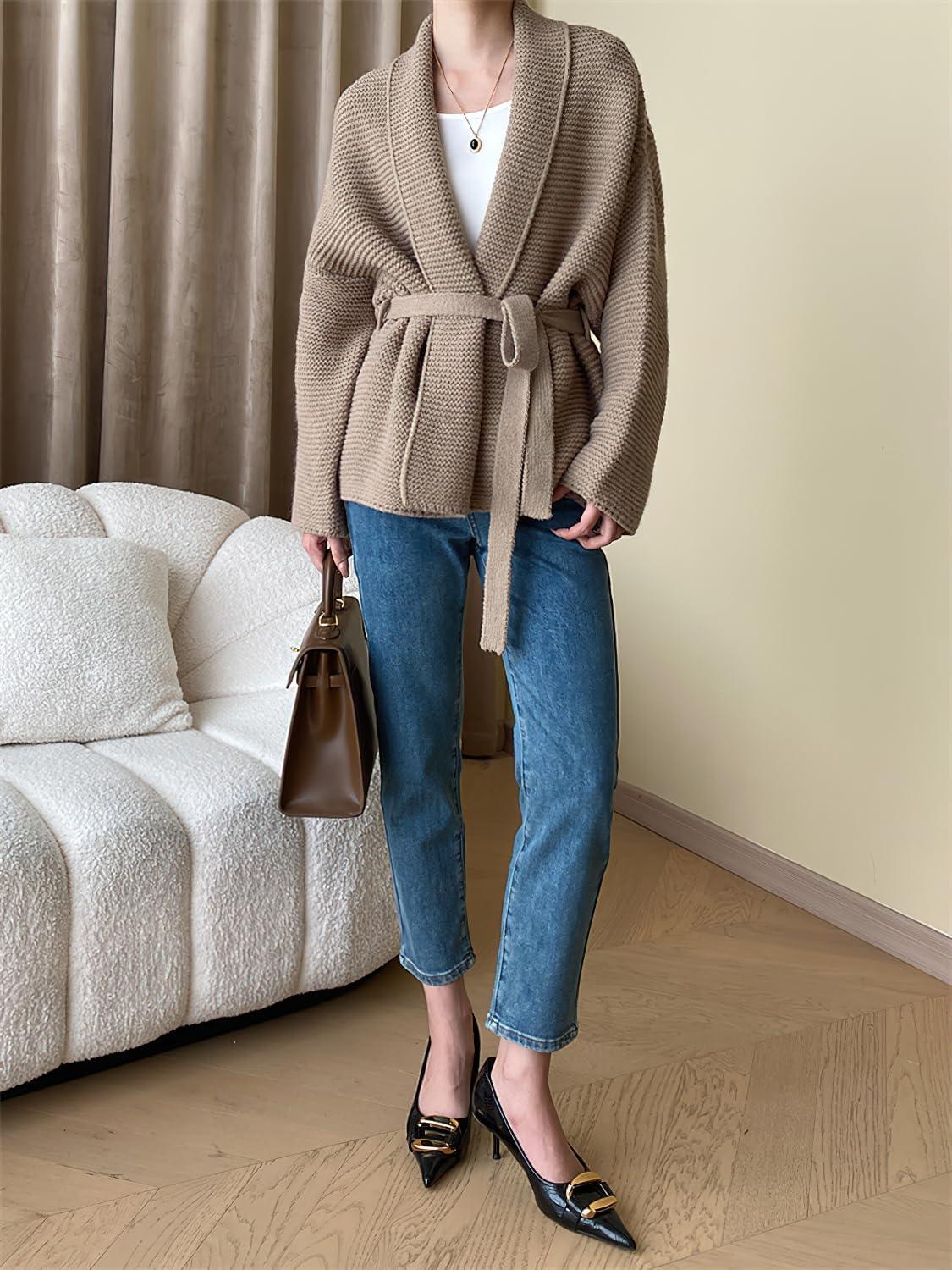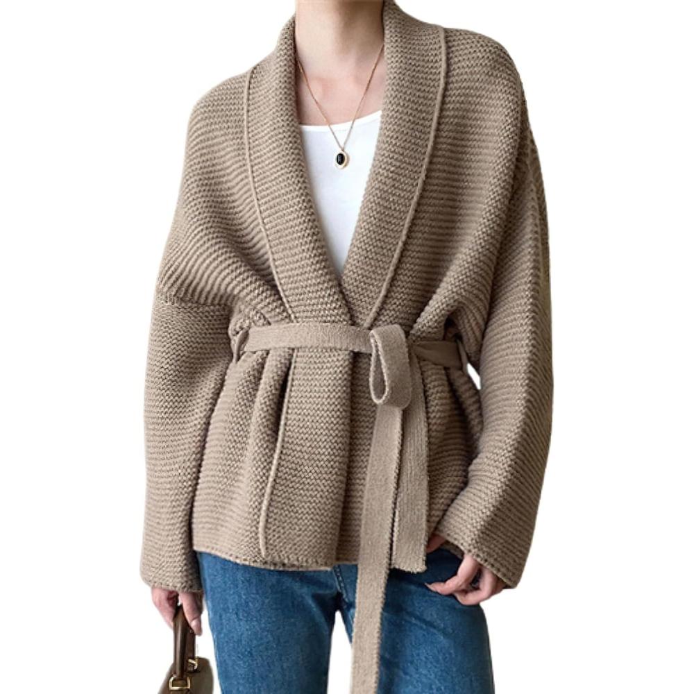 chouyatou Women's Shawl Collar Open Front Sweater Cardigan Chunky Knit Kimono Coat Outerwear with Belt(Coffee)