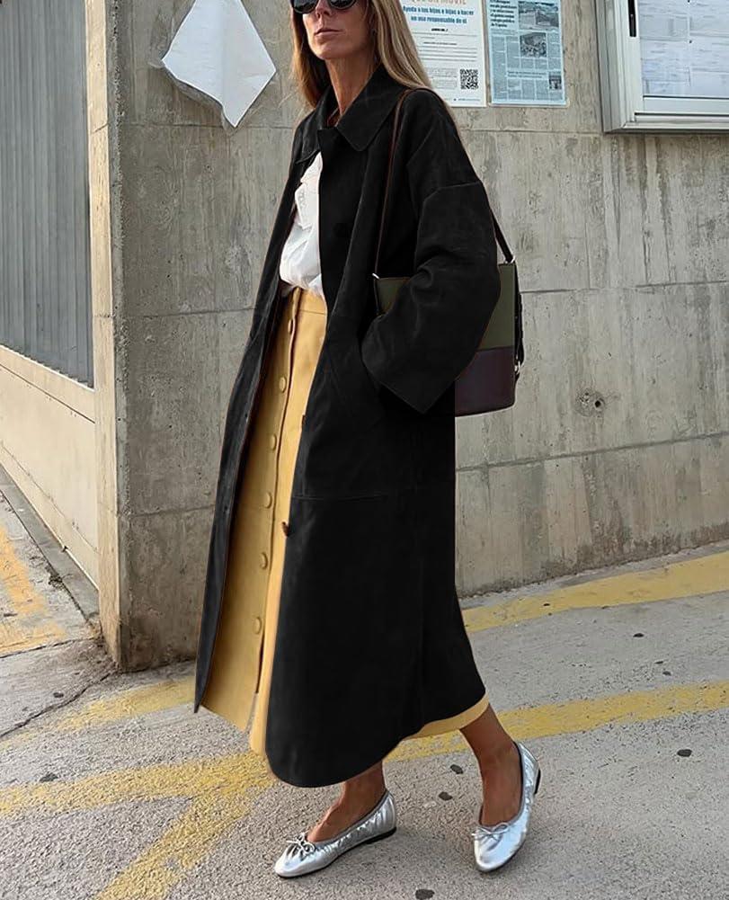 chouyatou Women’s Single Breasted Faux Suede Trench Coat Long Suede Leather Jacket Casual Lapel Pea Coat Overcoat(Black)