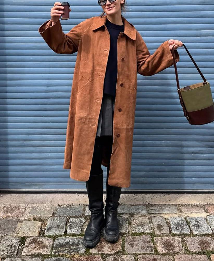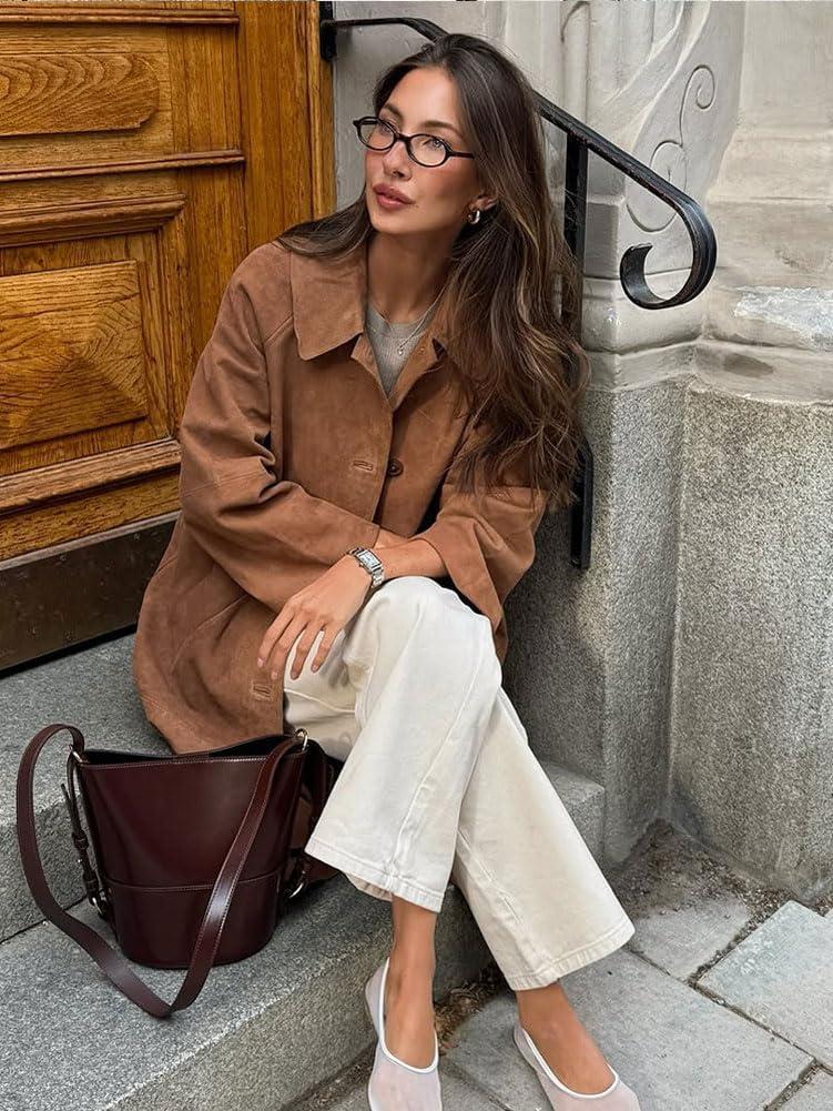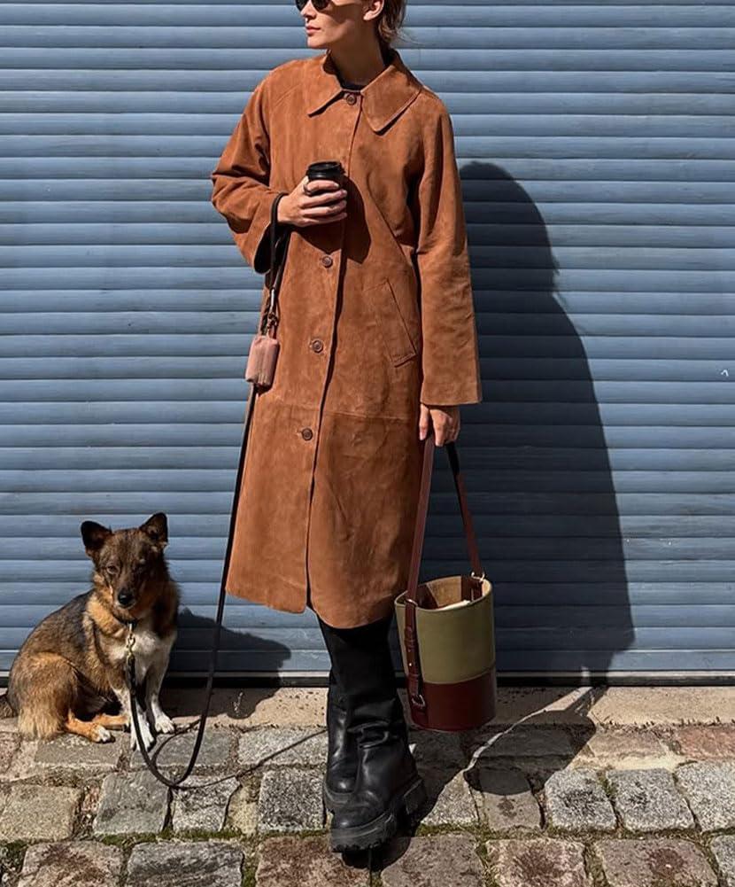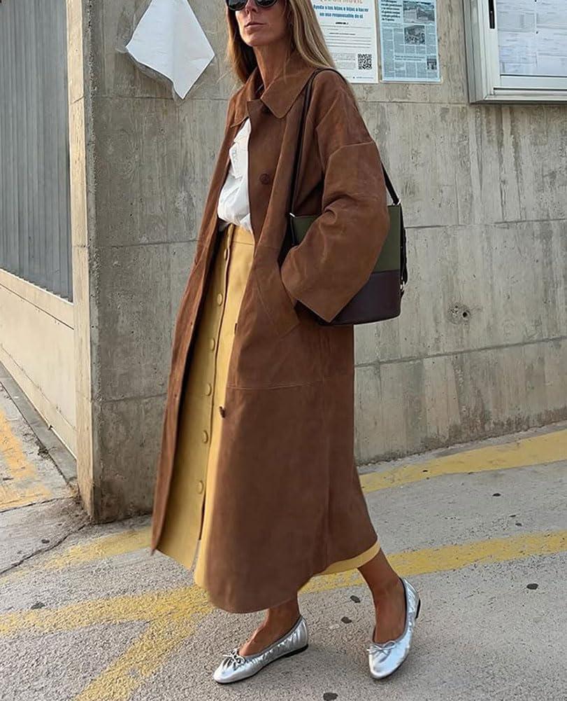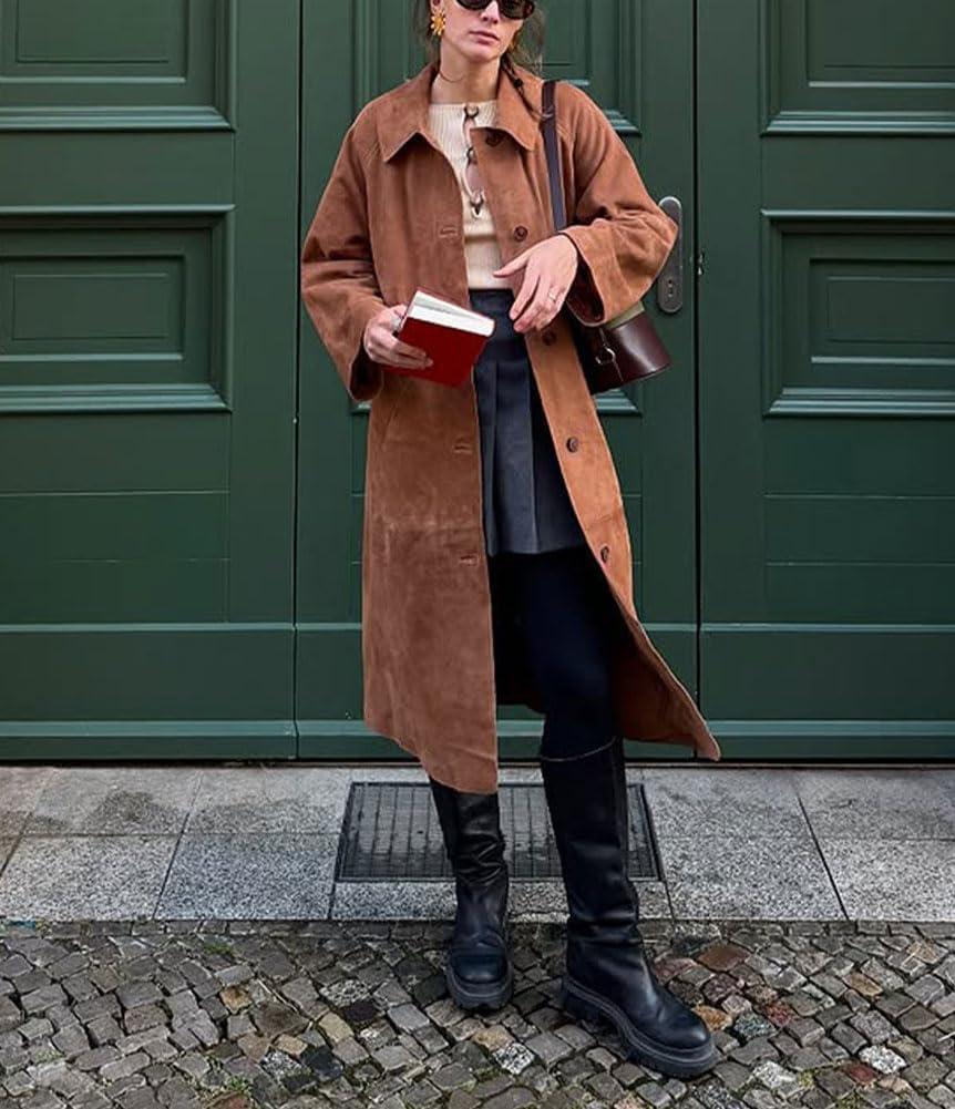 chouyatou Women's Single Breasted Faux Suede Trench Coat Long Suede Leather Jacket Casual Lapel Pea Coat Overcoat(Brown)