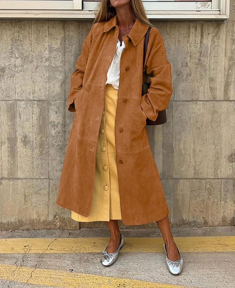 chouyatou Women's Single Breasted Faux Suede Trench Coat Long Suede Leather Jacket Casual Lapel Pea Coat Overcoat(Khaki)