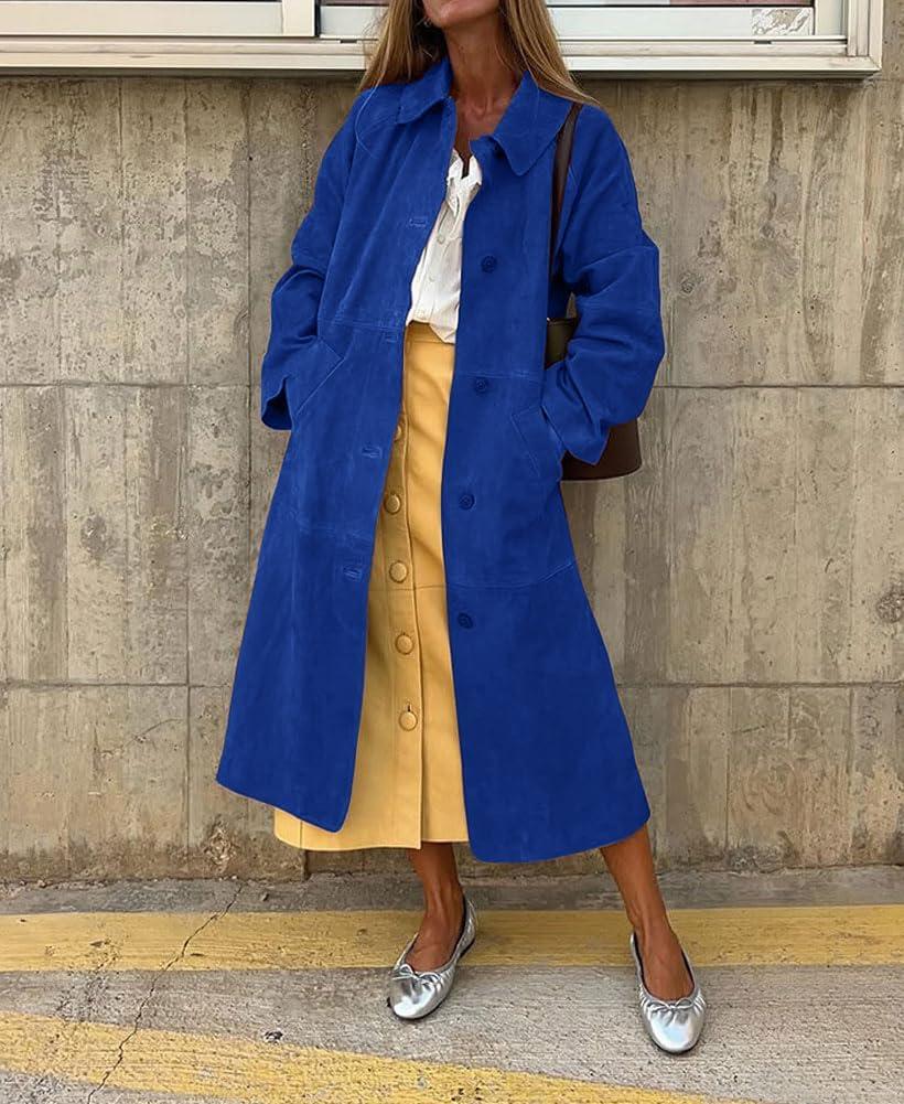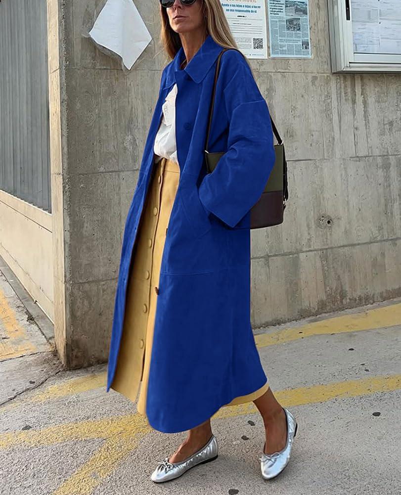 chouyatou Women’s Single Breasted Faux Suede Trench Coat Long Suede Leather Jacket Casual Lapel Pea Coat Overcoat(Royal Blue)