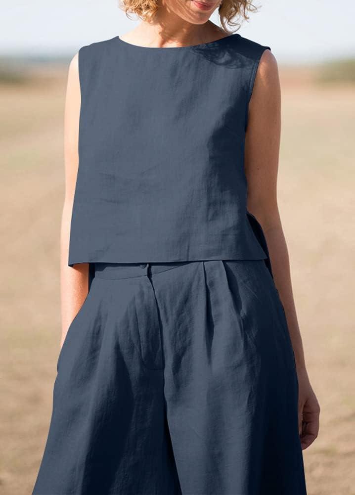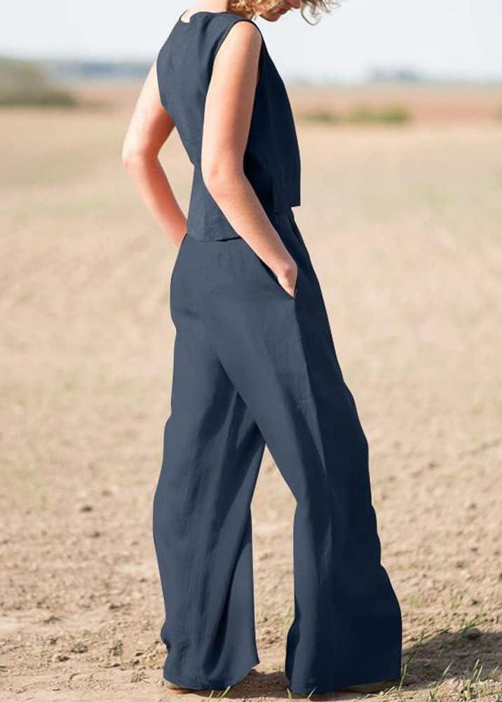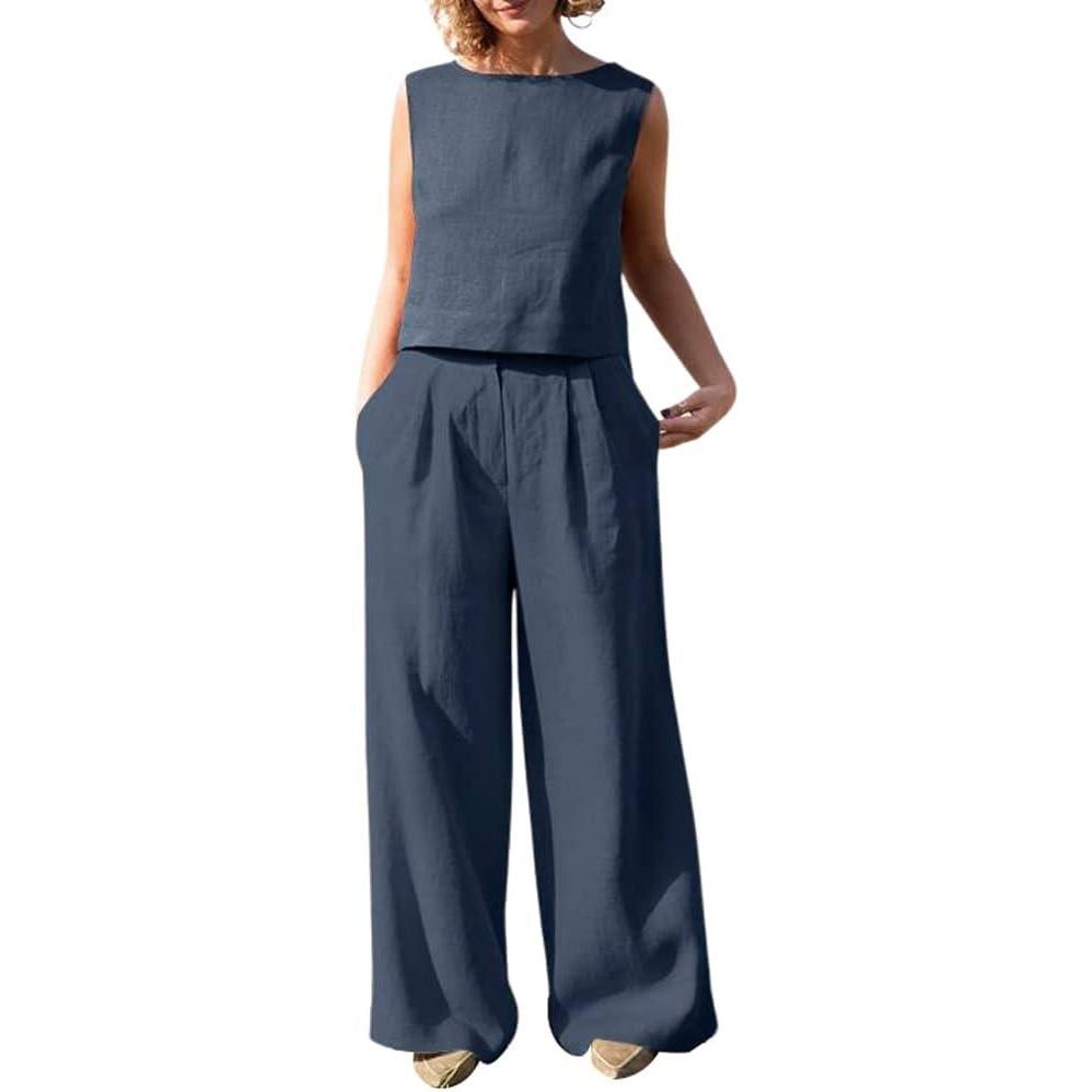 Get up to 60% off on chouyatou Women’s Summer 2 Piece Outfits Vacation Linen Sleeveless Tank Top Wide Leg Pant Sets(Dark Blue) styles during our winter sale event.